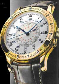 Как предполагалось использовать часы со всеми этими шкалами в навигации? Предположим, часы были установлены по радиосигналу на точное среднее время по Гринвичу: в момент последнего сигнала с помощью выдвинутой в первую фиксированную позицию заводной головки центральный диск циферблата повёрнут так, что в этот момент метка "60" совпала с секундной стрелкой. Часы при этом не останавливаются. Пусть, например, в полдень (наступление этого момента определяется секстантом) часы показывают 20 часов 17 минут 37 секунд (как на часах на наброске Линдберга в предположении, что при установке точного времени по Гринвичу отклонение часов не превышало 1 минуту и вращение центрального диска делалось вперёд при спешке часов и назад при отставании, в данном случае часы отставали примерно на 15 секунд). Пусть для данного дня заранее определённое по таблице уравнение времени, то есть отклонение истинного положения Солнца от среднего времени, которое показывается часами, составляет плюс 2 минуты 15 секунд. Коррекция на уравнение времени также производится заранее вращением ободка против часовой стрелки на 2 минуты, что соответствует двум делениям, выгравированным на боковой поверхности корпуса непосредственно под ободком. Если значение уравнения времени отрицательно, ободок следует вращать по часовой стрелке. УГОЛ по долго- те относительно Гринвича будет вычисляться следующим образом: