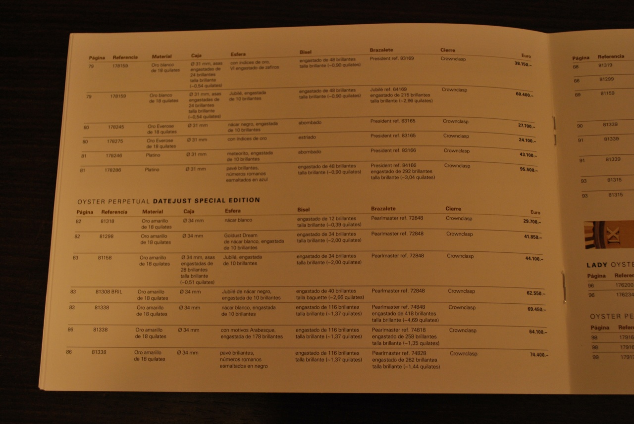 Вообще-то у Ролекса есть официальный каталог с ценами MSRP, отпечатанный типографским способом. Его можно получить у любого дилера в Европе, не говоря уже о бутиках. Вечером попробую сделать фотографии и разместить, там немного страниц. Брошюра, правда, на испанском, но названия моделей, рефы и цены будут и так понятны.