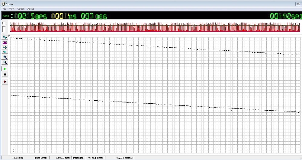 Tickoprint, который строит график, вел себя весьма забавно. В основном я смотрел на 140 ударах метронома в минуту. Если на метрономе сразу поставить 140 ударов, то где-то 30-40 первых секунд график идёт вкривь и вкось но потом выпрямляется и идёт как надо. Но если, когда график уже идет как надо, поставить не 140 а 139 ударов в минуту, то график начинает постепенно заворачивать (что ожидаемо), и скажем если после 30 секунд опять вернуть 140 ударов в минуту, график продолжает идти криво еще минут 5-7, постепенно выпрямляясь.
