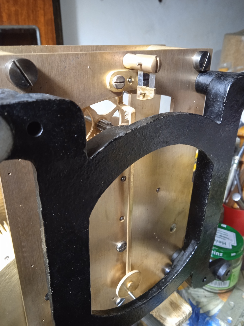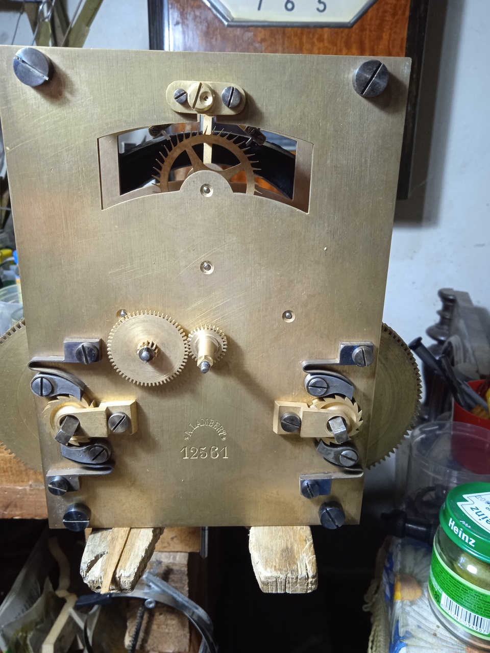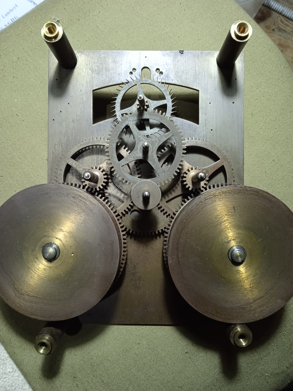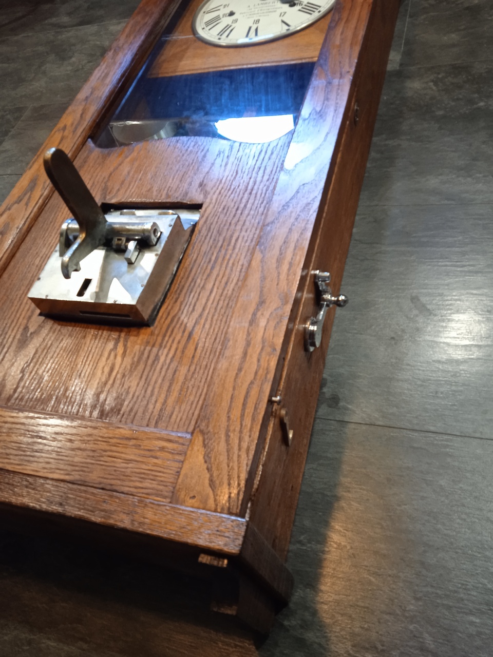 Приветствую, форум. Довелось мне пообщаться с такими вот интересными часиками. Механизм с двумя мощными заводными барабанами, которые двигают и стрелки и через карданный вал колёса календарного механизма (на карточке печатаются минуты, часы и день недели). Всё было в очень грязном! состоянии (наверное, часы висели на проходной литейного цеха), но после обслуживания всё заработало отлично.