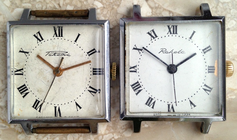 Часы с механизмом Ракета 2209 в квадратном золочёном корпусе, циферблат золочёный, 8 квадратных золочёных меток на 1, 2, 4, 5, 7, 8, 10, 11 часов. Сравнение с серебрёным циферблатом.