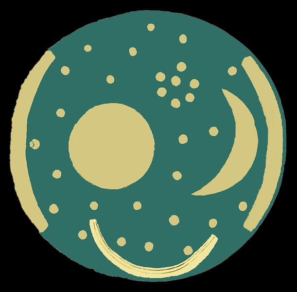 Это «одна из наиболее любопытных и, по мнению некоторых ученых, дискуссионных археологических находок последних лет. Это бронзовый диск, датируемый 1600 г. до н. э. В диаметре он составляет 32 см (приблизительно тот же размер, что и у виниловой пластинки) и весит около 4 фунтов. Диск выкрашен в сине-зеленый цвет и покрыт символами из листового золота. На нем размещены полумесяц, солнце (или полная луна), звезды, дугообразная кайма (которую называют солнечной ладьей) и полоса на крае диска (которая, вероятно, олицетворяет один из горизонтов). Вторая золотая кайма (на противоположной стороне) не сохранилась.
