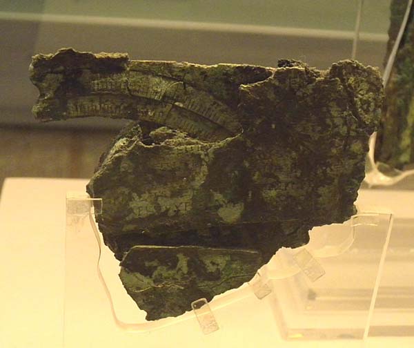 Наконец, на тонкой бронзовой пластине, прикрывающей передний циферблат, находилась т.н. "парапегма" - астрономический календарь с указанием восходов и заходов отдельных звезд и созвездий, обозначенных греческими буквами, корреспондирующими с теми же литерами на зодиакальной шкале.