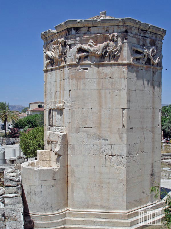 Из-за этих фигур башня и получила свое название – Башня ветров. Она стала практическим воплощением разделенной на восемь частей розы ветров, изображение которой встречается еще в трудах Аристотеля и Эратосфена. Башня исполняла в том числе и метеорологические функции – флюгер и рельефы на гранях позволяли определить, какой ветер дует в данный момент. Но главный секрет таился внутри сооружения. Туда ведут два входа, расположенные с северо-восточной и северо-западной сторон. Перед ними некогда были устроены небольшие портики с фронтонами, опиравшимися на две коринфские колонны, от которых сохранились лишь нижние части. От колоннады внутри здания вообще не осталось никаких следов, равно как и от находившихся здесь больших водяных часов – клепсидры.