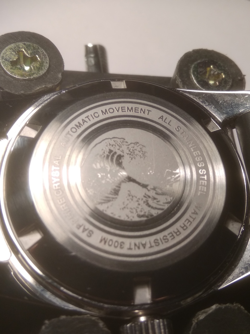 сапфир (проверено прибором). Не стекло, а почти линза. За счет этого часы кажутся слепыми – масса бликов и игры света, хотя игра света в самом сапфире привлекает внимание светлыми окружностями внутри сапфира. Индексы стоят ровно и светомасса залита аккуратно. Безель с керамическим инсертом и стоит мертво: четкое вращение, ни намека на люфт и бэкплей. Люм только на метке. Цифер санберст серый – очень приятный цвет, специально взял такой. Между ушами корпус обработан лучше обычного – его полировали. Следы вырубки еле видно под углом. Со стороны крышки на выточке под браслет между ушами отчетливо видно следы инструмента. Голова на резьбе, футор длинный и с сальником. Резьба на крышке больше обычного, на самой крышке имеется гравировка Большой волны. Корпус по бокам зеркальный, сверху брашированный. На переходе верхняя-боковая поверхности зеркальной фаски нет, как на аналогичном SEESTERNе целиком брашированном. Люм хороший – суперлюминова, но только на стрелках и на метке безеля. На индексах люм не похож на обычный китайский, который светит ярко первые 5 мин, а потом тухнет навсегда. Этот люм светит еле-еле, тускло, сколько его не засвечивай, но долго, так же, как и на стрелках. Похоже на сильно разбодяженную люминову