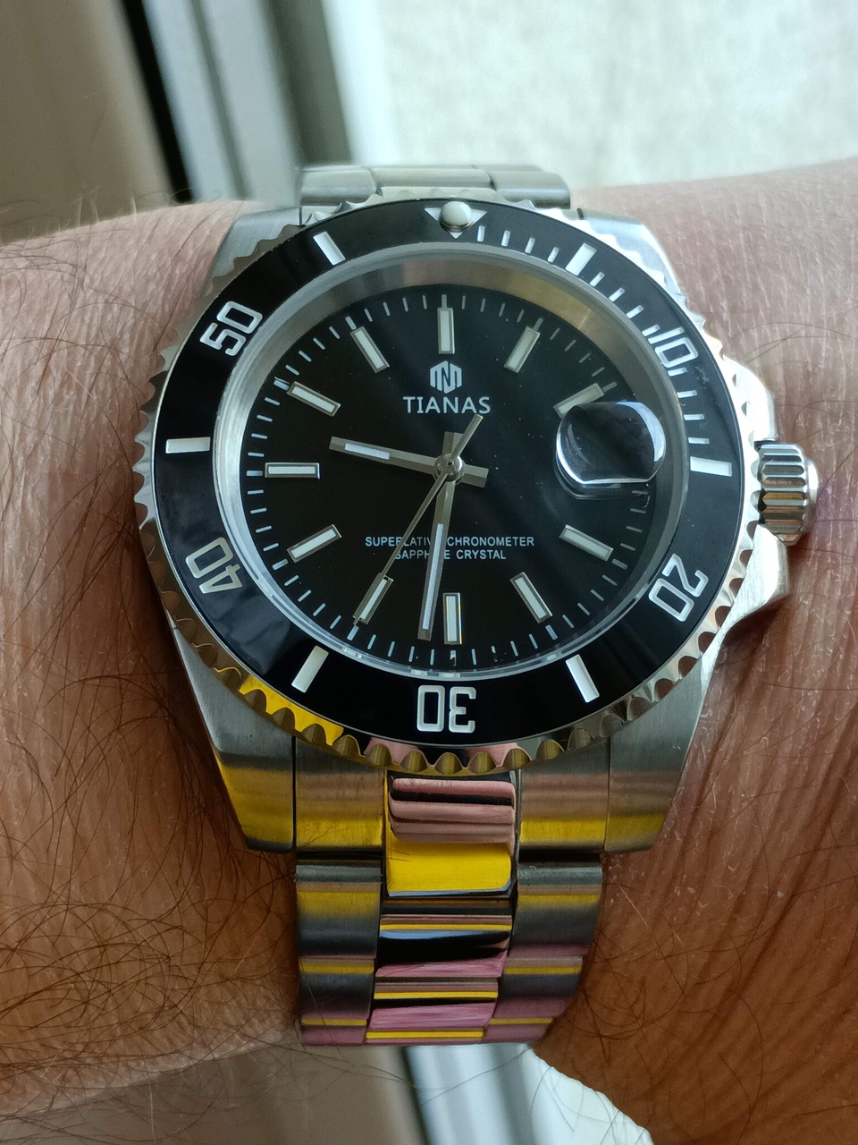 Ещё на реддите кто-то задавал вопрос по этим часам, мол, часы с заявленными ттх, не враки? Мне они глянулись тем, что стрелки не мерседесовские и метки не кругляши. Ну и для смеху купил их на распродаже в довесок к эпоху т100. Часы вполне крепкие, даже безель не люфтит. Из недостатков: надпись на цифере, браслет с бабочкой, да ещё короткий, мне на 19 см обхват уже почти без зазора, палец не пролезает; стекло выступает над безелем почти на полмиллиметра, ну и циклоп кривой. Как по мне, лучше бы совсем без даты.