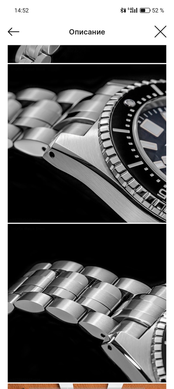сапфир, водо-защита 100м, нержавейка, безель односторонний (чуть люфтит, крутится очень легко со щелчками в одну сторону), браслет удобный, длинный (пойдёт на любую руку, снял пару звеньев), заводная головка большая, ухватистая, удобная, завинчивается долго на несколько витков (оборота 4). За эту цену нет претензий, если бы стоили чуть дороже, наверное, придрался бы к люму, он довольно хреноватый, синего цвета, в остальном от часов только положительные эмоции. Точность хода замерил - +20сек - что для меня не критично (хорошо, что спешат, если бы отставали, тогда бы было хуже). Сразу хочу сказать, часы маленькие 40мм, на моей медвежьей лапе в 19,5см смотрятся довольно маленькими, я привык носить 43-45-48мм; 40мм, конечно, маловаты, но для среднего и маленького запясться будут в самый раз. Интересное расположение окошка даты на 6-ти часах мне понравилось, у меня раньше таких не было, все часы - дата на 3-х часах. Очень неплохие часики с довольно оригинальным дизайном (хоть и хомаж на Хелм Комодо) на лето, да и не только - прелесть, под рубашку и под рукав отлично прячутся.