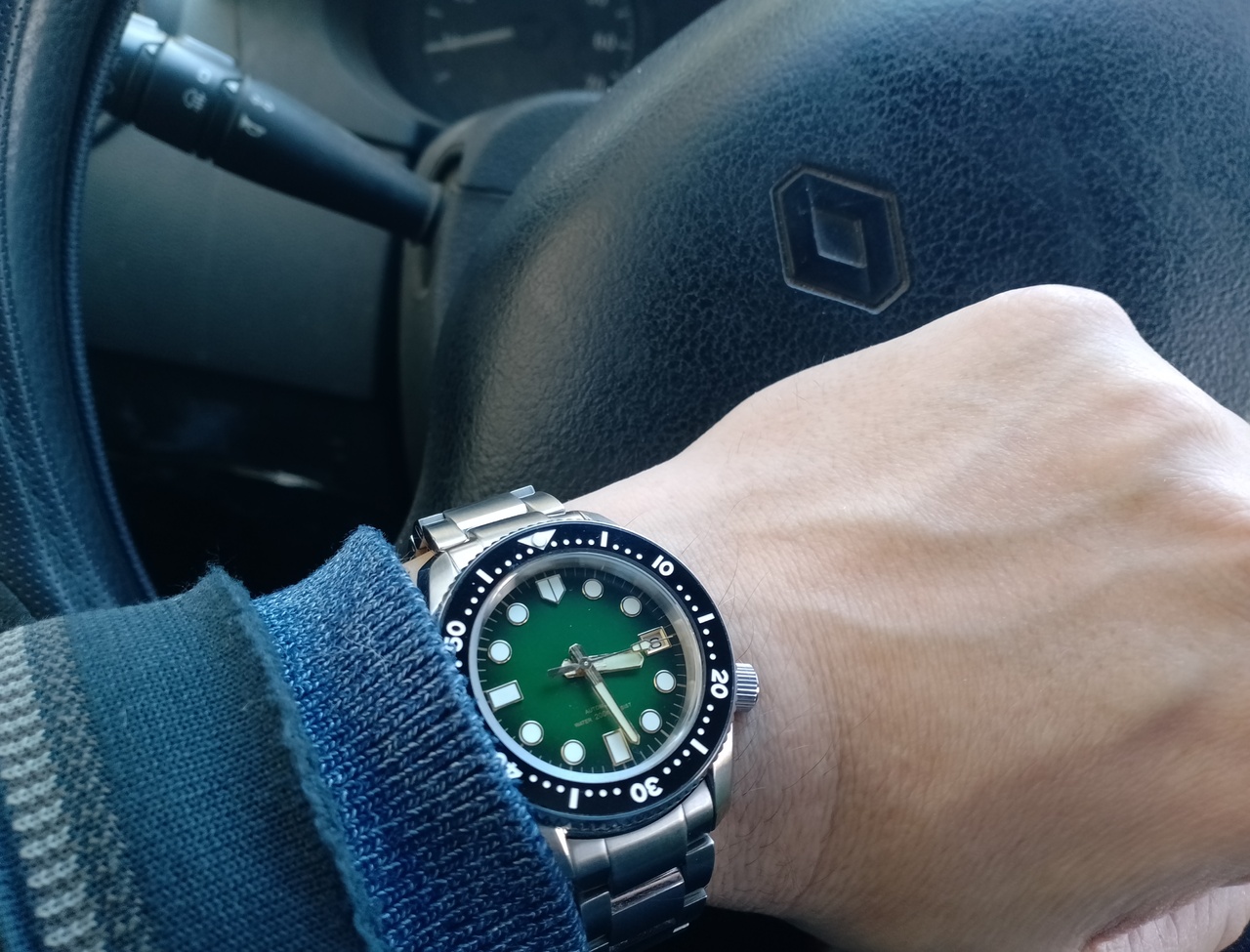 На день рождения себе любимому решил подарить позитивный весенний дайвер в зелёно-золотистых тонах по мотивам известного японского морского мастера (корпус и браслет - сталь 316, переднее стекло -