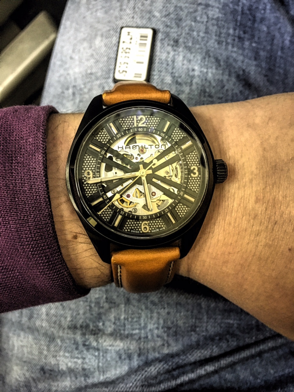Khaki Skeleton это высокотехнологичная современная модель, в дизайне которой большое внимание уделено деталям. Скелетонизированный трёхуровневый циферблат со структурной отделкой «пчелиные соты», частично перекрывающийся лопостями X-образного пропеллера — потрясающий трехмерный шедевр. В дополнении к этому привлекающее внимание контрастное цветовое исполнение подчёркивает, что данная модель создана для мужчин с сильным характером, желающим выделиться из толпы.