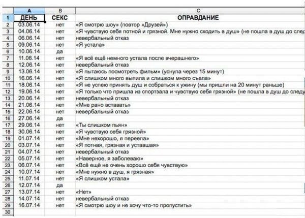 Мужик-программист завел эксель файл, в который ежедневно записывал отмазки жены от секса.