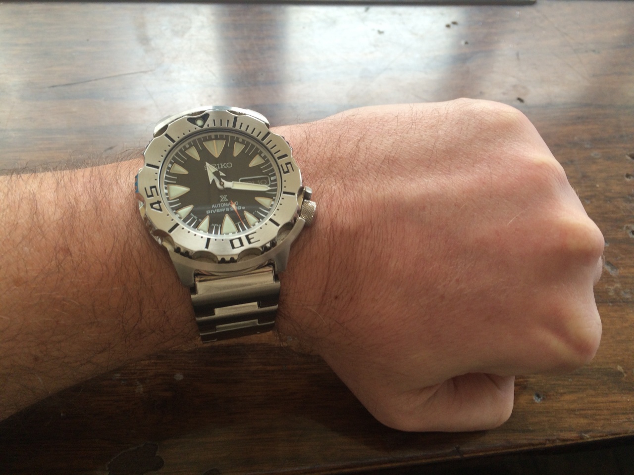 У меня эти часы заняли прочно место на руке. Очень понравились,настоящие мужские часы,смотрятся даже на моем тощем запястье 17. А ведь раньше я смотрел картинки и просто прикалывался с этих часов. В них меня устраивает все: механика с отнють не плохой точностью, настоящий мужской вид с литым ,толстым браслетом,отличный люм, водонипроницаемость уровня "дайвер". Единственное , к чему пришлось привыкнуть-форма стрелок. Эти часы кстати очень заметны на руке, постоянно от окружающих идут вопросы-что за часы? Летом же они вообще шикарно будут выглядеть. Долго выбирал между черными и оранжевыми монстрами,хотел оба брать,но увы финансы мне не позволили-пришлось сделать выбор. решающем фактором стала как бы универсальность к разным типам одежды черного монстра. Советую всем-часы классные!