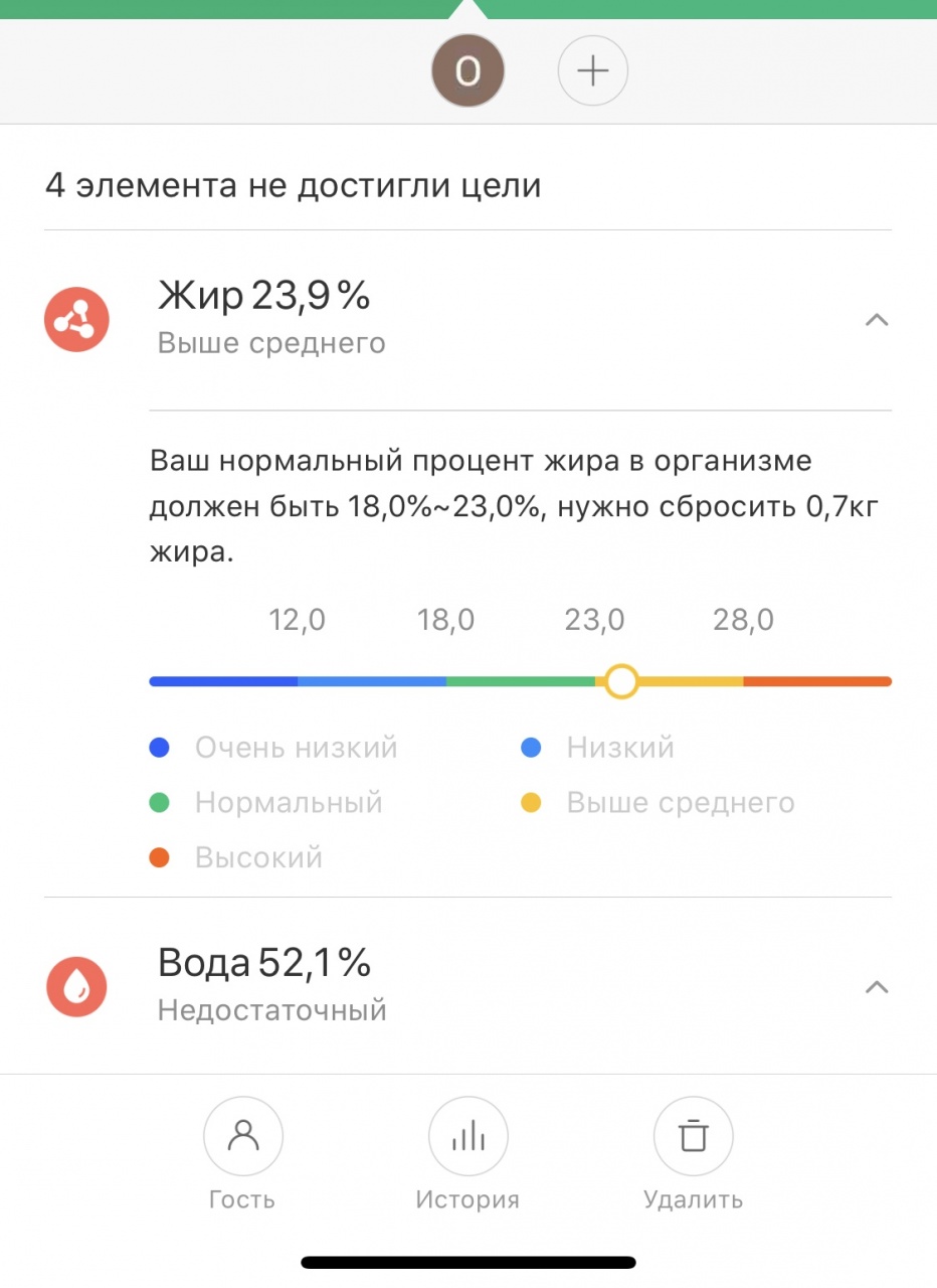 Потом я еще опытов поставил. К примеру, быстро выпитое существенное количество воды - ничего не дает показателю воды, зато катастрофически обваливает показатель жира