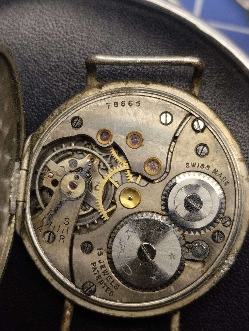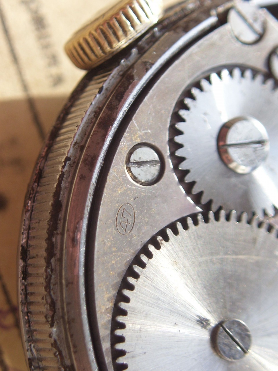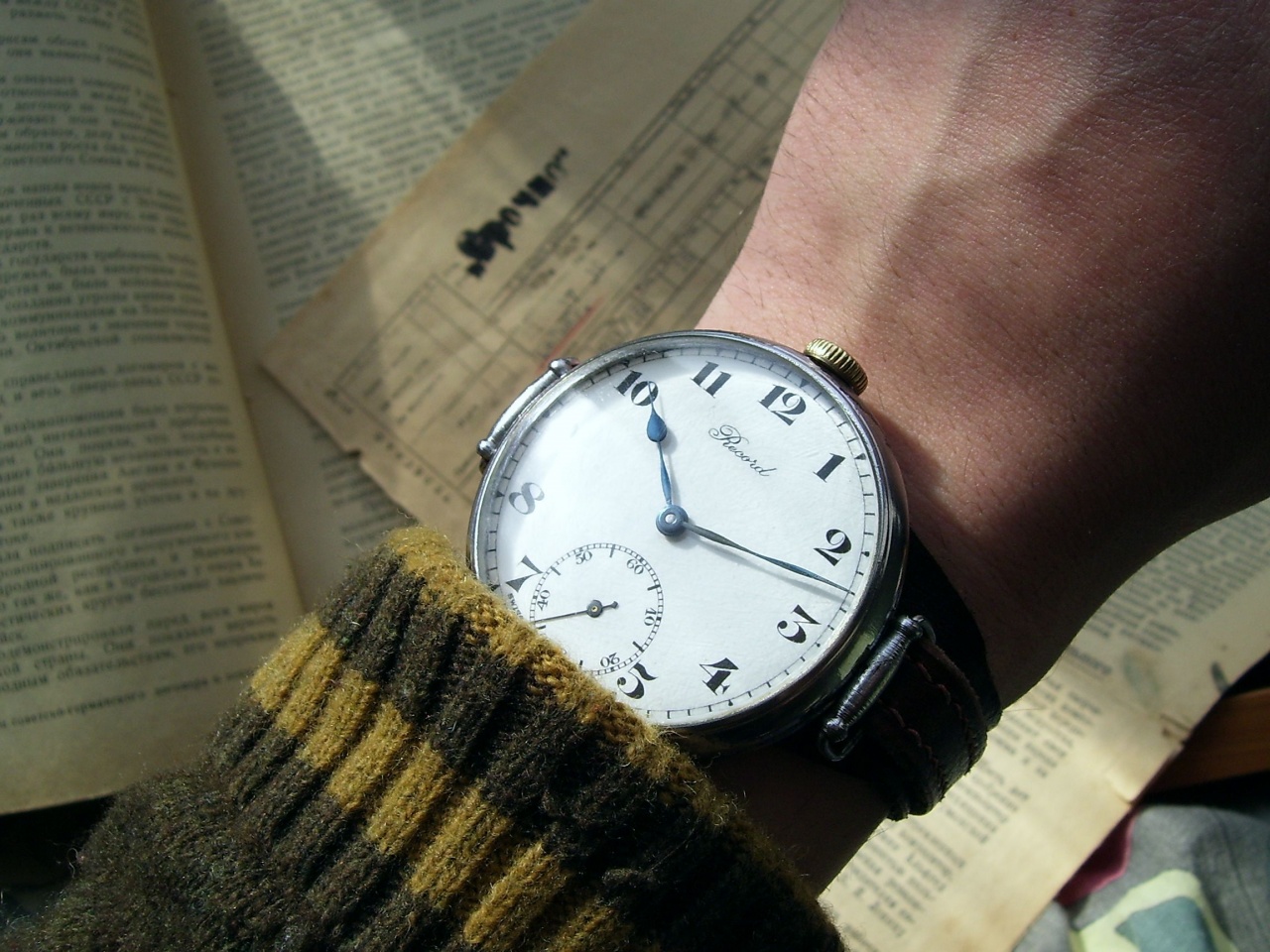 Отдельного упоминания заслуживает механизм - удешевленный крупный калибр Record 47 производства швейцарской Record Watch co. - довольно приличного производителя, часто выпускавшего часы классом выше среднего. Часы на этом калибре периодически встречаются в артельных корпусах, что позволяет предположить более-менее массовый и централизованный ввоз этих механизмов в СССР. Данные