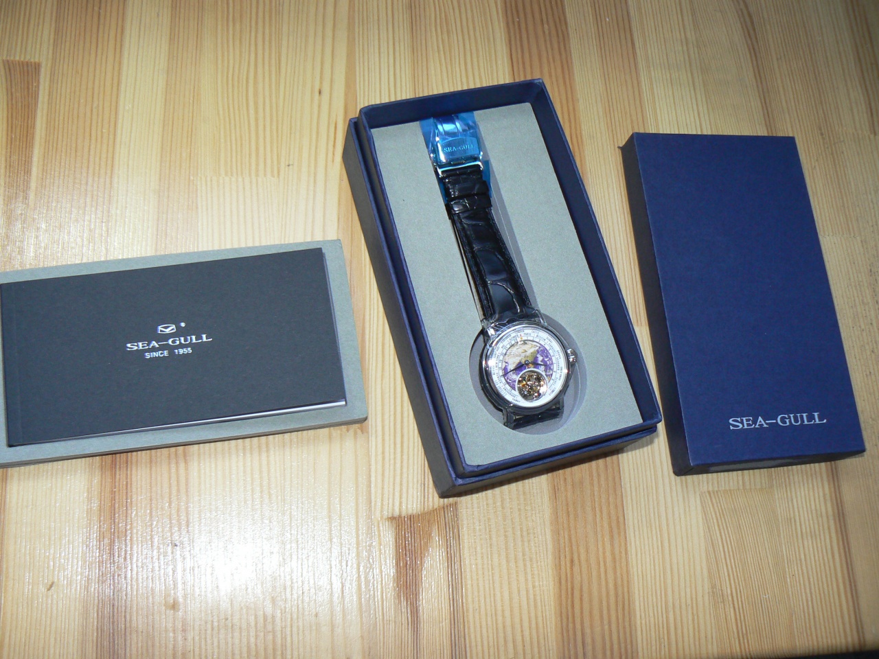 Искал на китайской площадке «TaoБao». И вот посылка пришла. Упакована как обычно – картонная коробка, пузырчатая плёнка, скотч. Сами часы оказались в обычной картонной коробке синего цвета с лого Sea Gull. Внутри толстая книжка-инструкция на китайском и английском, и китайский гарантийный талон – ничего особенного. Ну и сами часы упакованы по стандарту – на стёклах плёнки, застёжка ремня обёрнута синей плёнкой. Дополнительно китайцы полностью обернули сами часы прозрачной плёнкой.