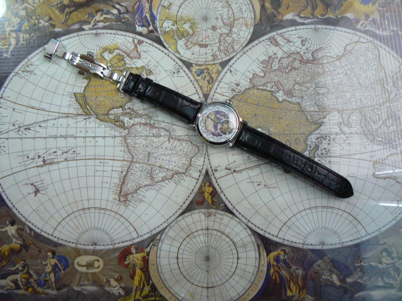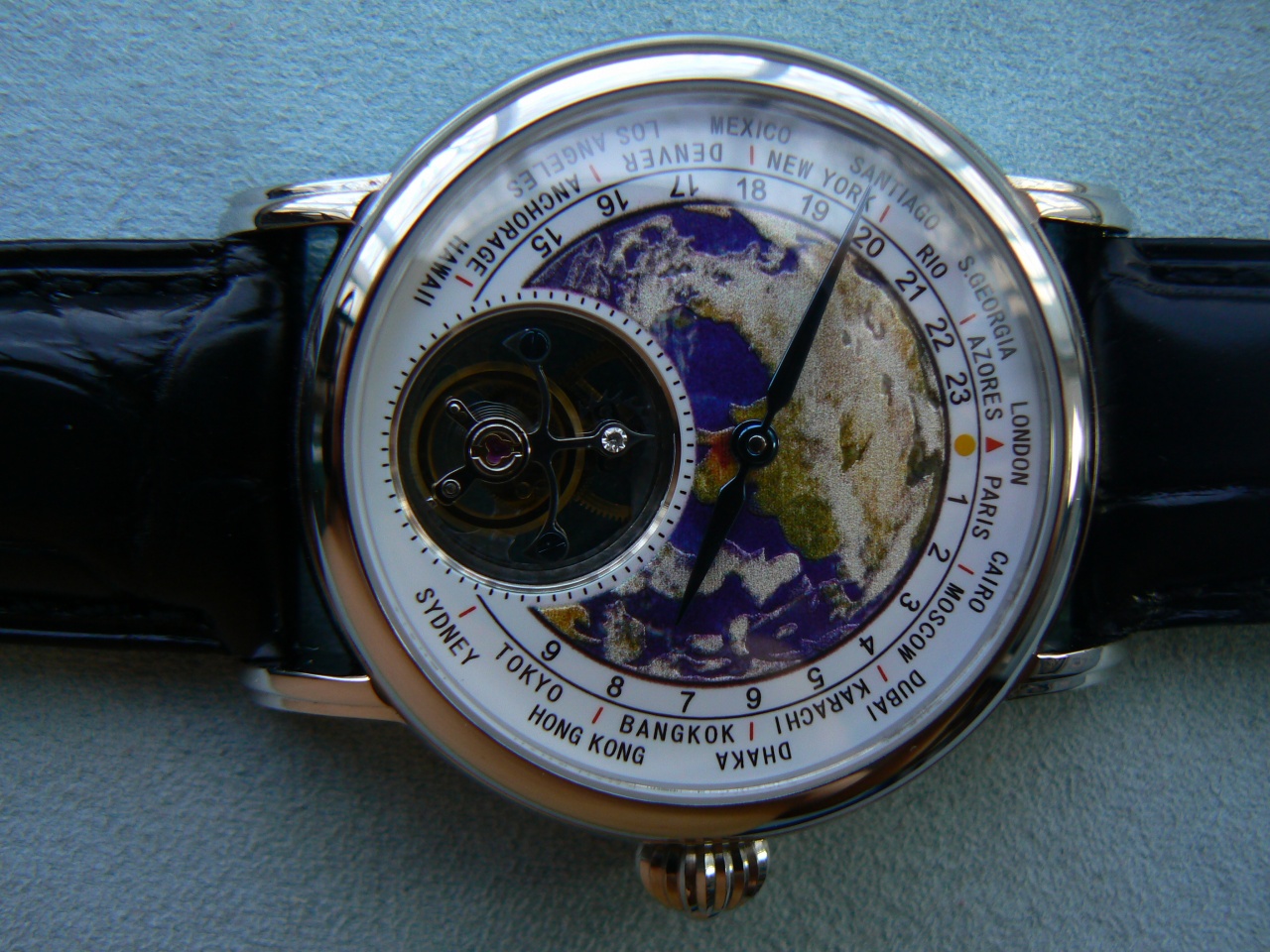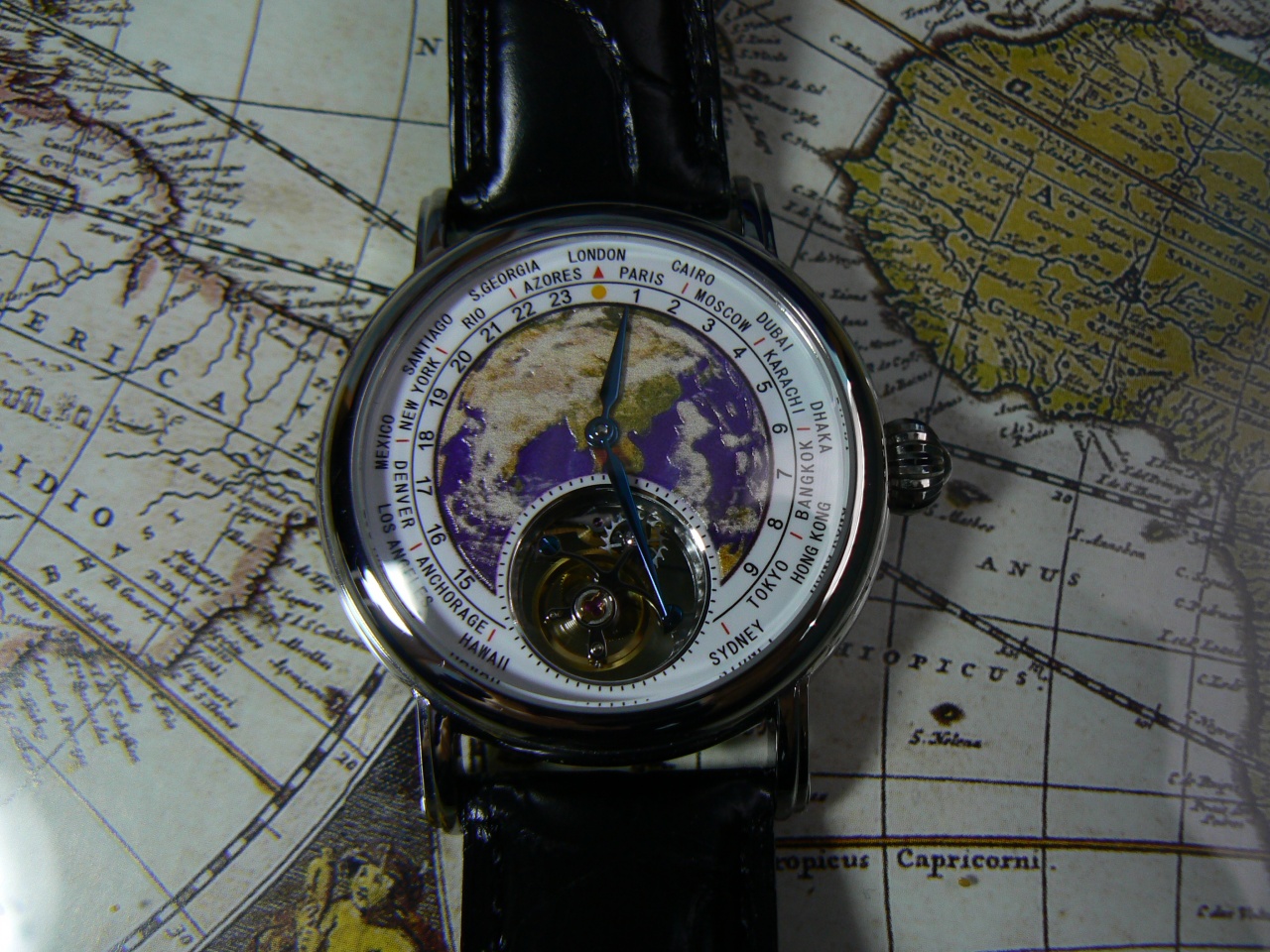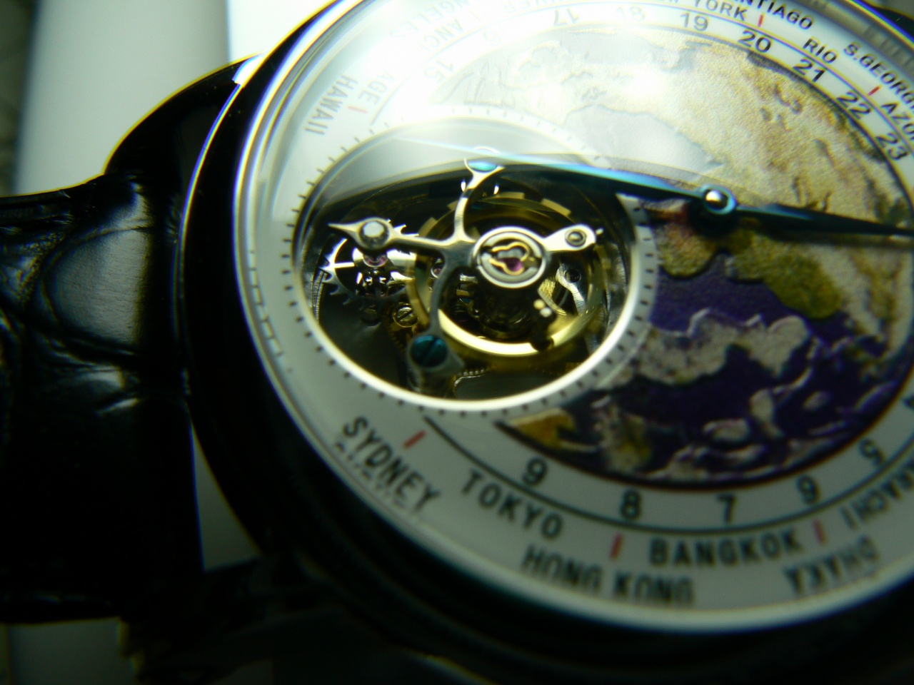 Второе, это абсолютная нечитабельность (скорее трудночитабельность) циферблата. С ходу понять, какое время показывают часы очень сложно. Синие стрелки сливаются с синевой океана на изображении Земли, а внятное отсутствие меток подливают масла в огонь. Метки, конечно же, есть. Но они очень маленькие, нанесены между большого количества букв в названиях городов, потому их практически не заметно. Эту особенность я видел до решения о покупке, и был к этому готов. Считывание времени для меня не было необходимостью. Я желал познакомиться с самим турбийоном. Да и заказывал эту модель часов с перспективой дальнейшей замены циферблата с помощью товарища ювелира (но это будет отдельная история).