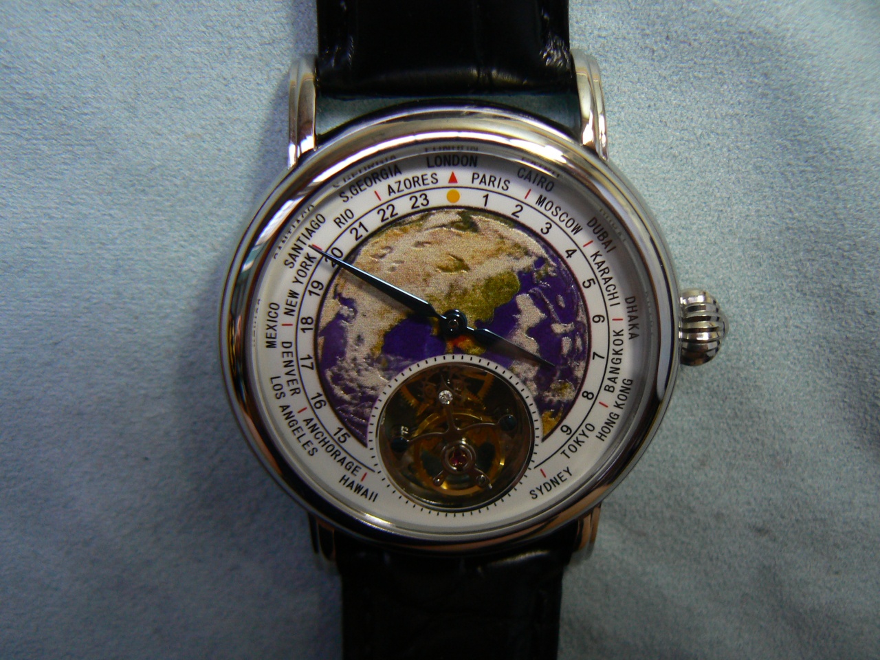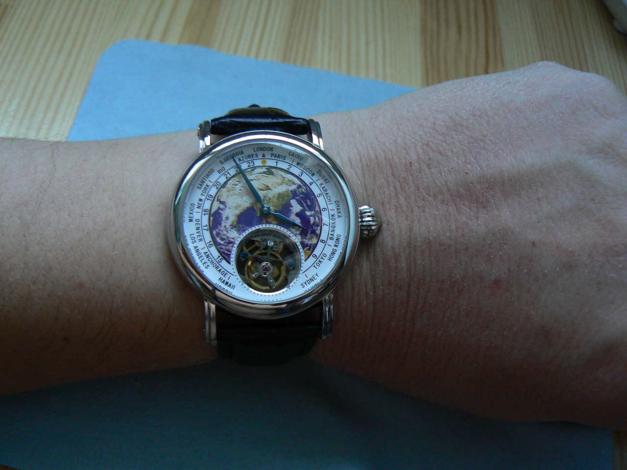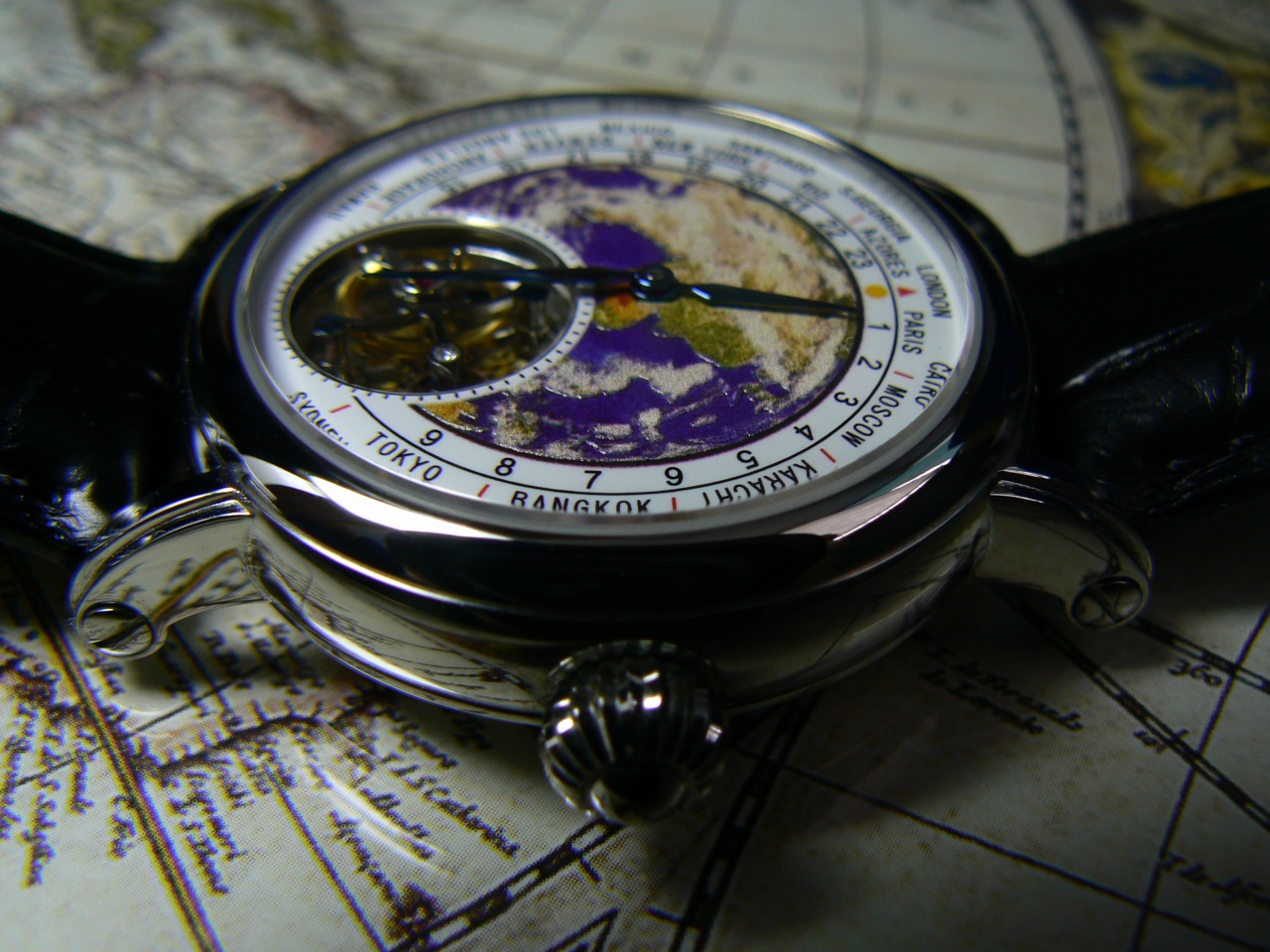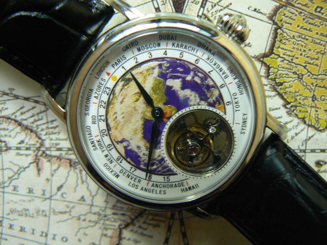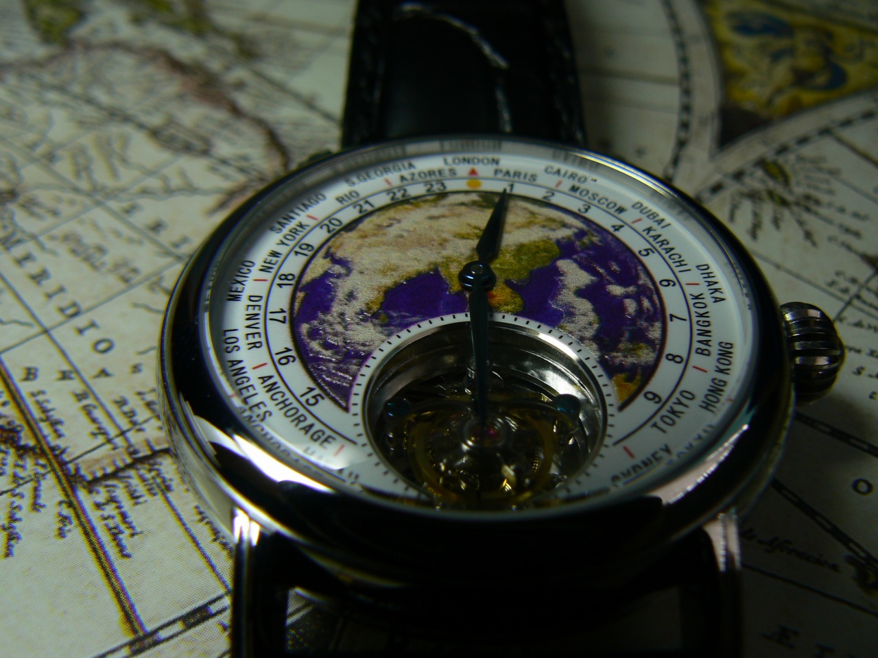 Второе, это абсолютная нечитабельность (скорее трудночитабельность) циферблата. С ходу понять, какое время показывают часы очень сложно. Синие стрелки сливаются с синевой океана на изображении Земли, а внятное отсутствие меток подливают масла в огонь. Метки, конечно же, есть. Но они очень маленькие, нанесены между большого количества букв в названиях городов, потому их практически не заметно. Эту особенность я видел до решения о покупке, и был к этому готов. Считывание времени для меня не было необходимостью. Я желал познакомиться с самим турбийоном. Да и заказывал эту модель часов с перспективой дальнейшей замены циферблата с помощью товарища ювелира (но это будет отдельная история).