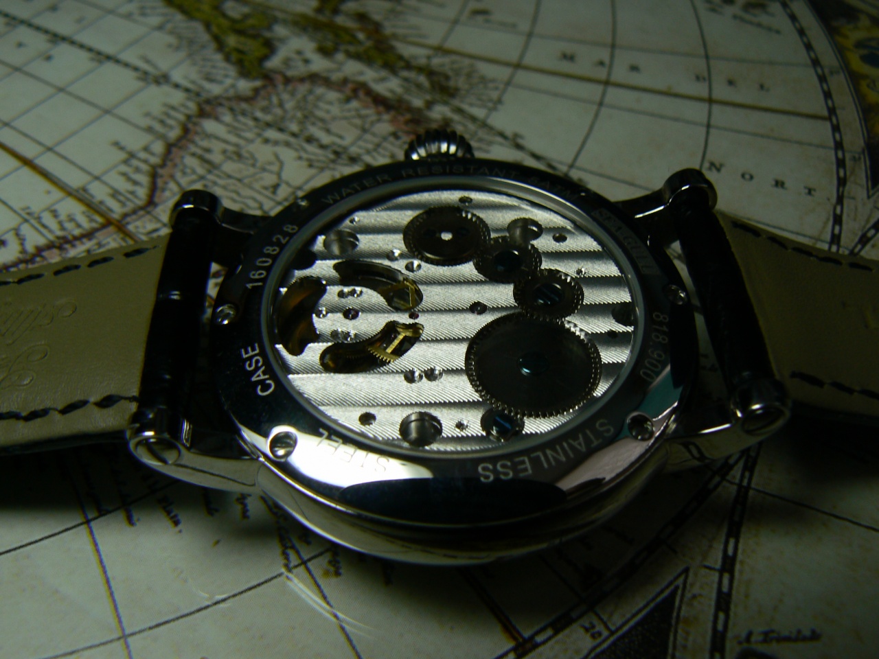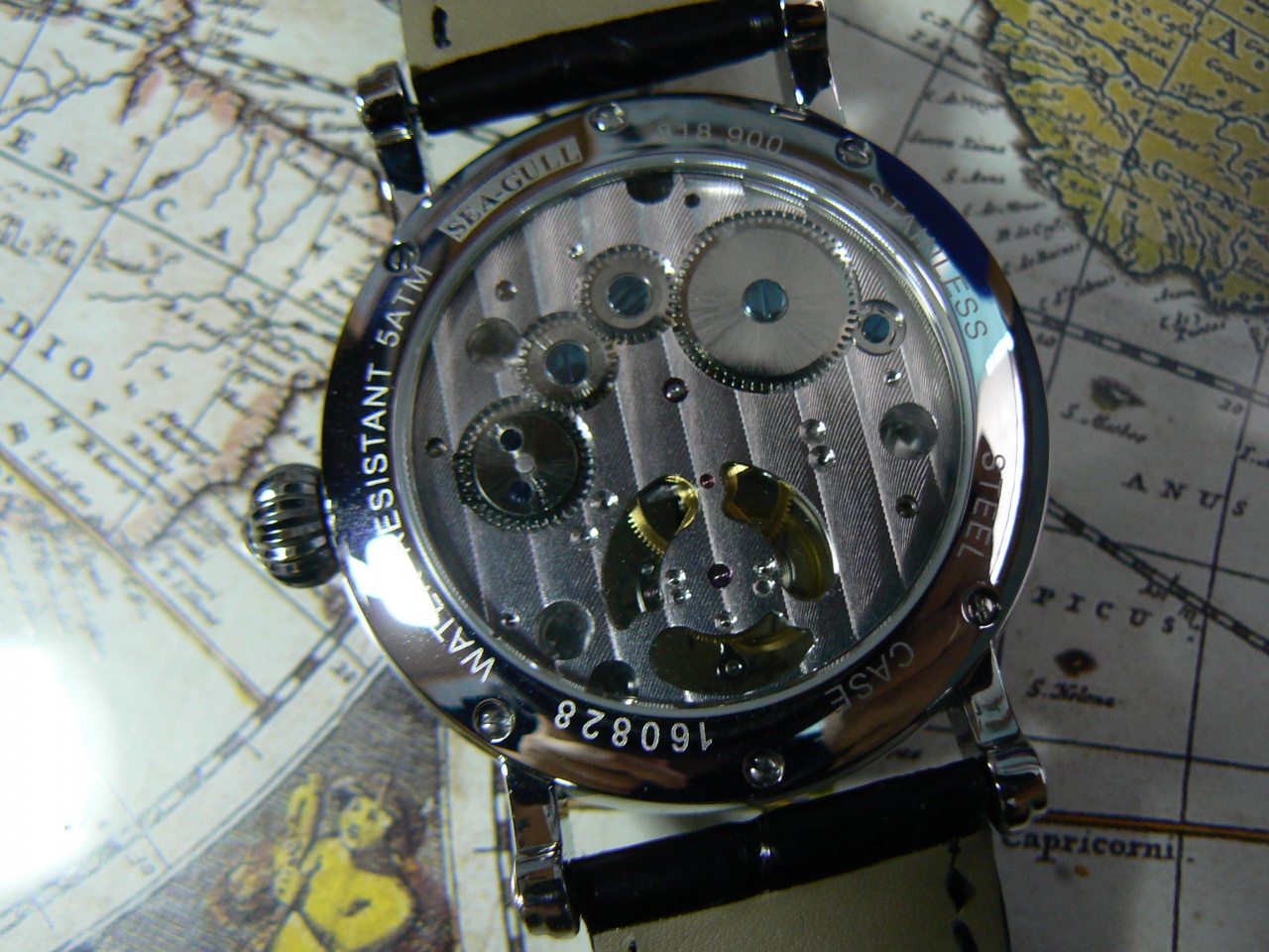 Сзади. Стальная крышка на шести винтах, с гравировкой производителя механизма (Sea Gull), уровня водозащищённости (5 АТМ), материал корпуса (stainless still), номера модели и серийного номера. Под задним стеклом вид на механизм ST800 производства Sea Gull, с функцией турбийона и ручным заводом. У продавца была версия на автомате, но она была несколько дороже и толще корпус. Механизм выполнен аккуратно, пятен, царапин, волосков, отпечатков пальцев я визуально не обнаружил. Скромная отделка присутствует, но… ничего фантастического.