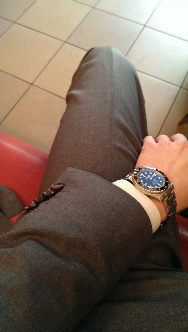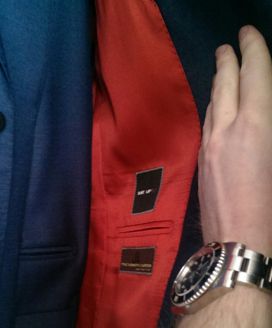 Посмотрите подкладку в рукавах, наверняка она будет другого цвета. Так же стоит взглянуть на подкладку брюк и её отстрочку.