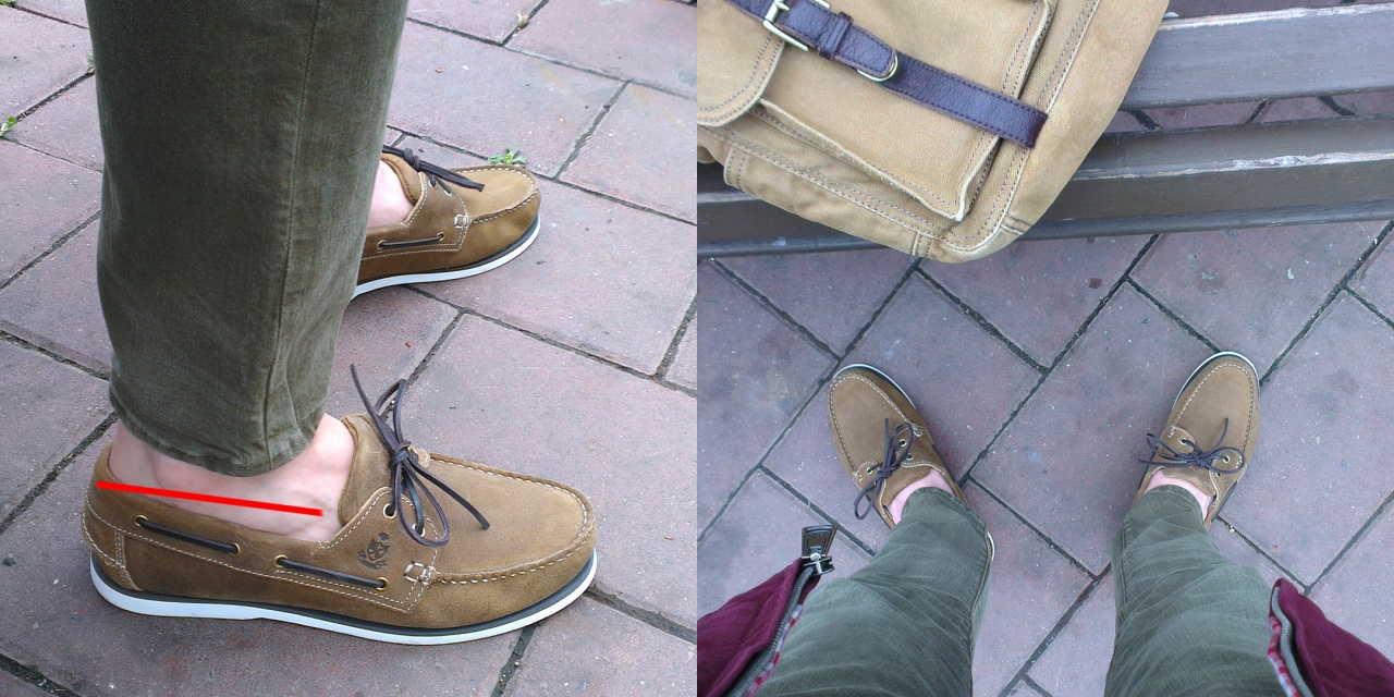 Камрады, нужен фидбэк. Штаны покупал специально узкие и чуть короче, чем обычно, чтобы носить с челси. Но сегодня попробовал их надеть с топсайдерами. Первое фото сделано сидя, т.е. они приподнялись. Стоя у них край ниже, пометил красной линией. Слишком коротко для носки с топсайдерами / кедами / монками? Или нормально?