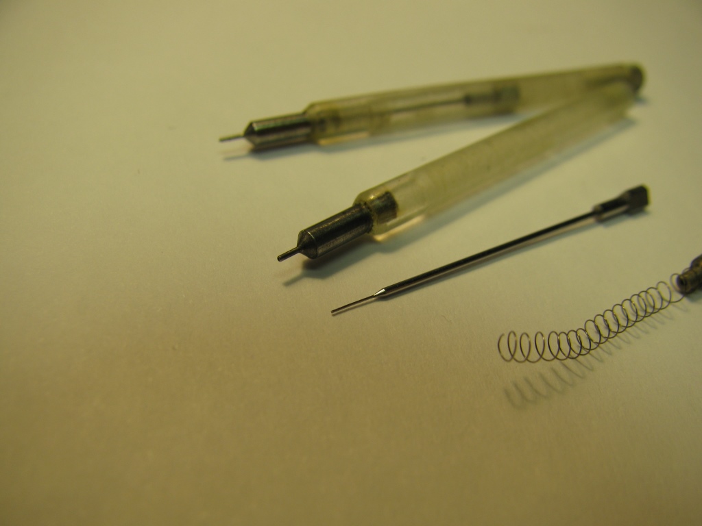 Перебирал наследство, нашёл интересные автоматические маслодозировки, работают хорошо (нажимом на иглу), но смущают размеры: длина 45 мм, диаметр 3 мм. Не похоже на домашнее изобретение.
