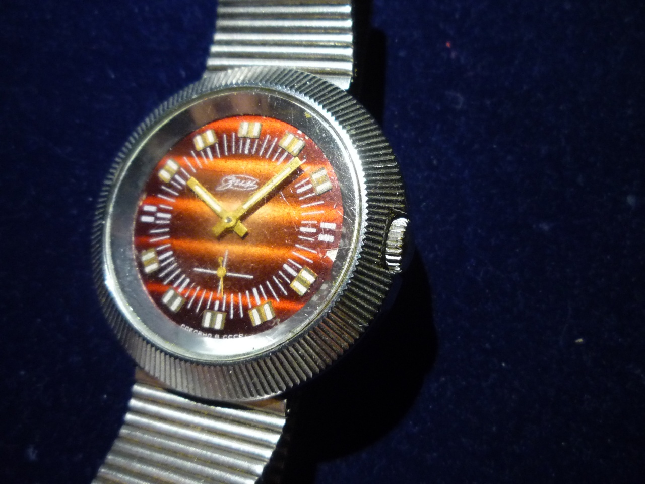 1. Луч. Не встречал раньше таких. Унисекс вариант, дочка уже на них с интересом посматривает. Прекрасное состояние, очень интересный коричнево-золотистый циферблат, красиво играющий под разными углами освещения. Часы на ходу. Внутри - 2209. Ремешок уже мой.