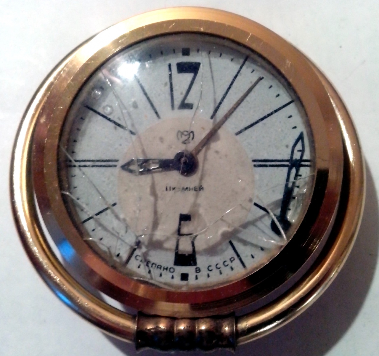 Пара часов, которые тоже хочется себе оставить. Складной будильник, 2 МЧЗ , как я понял. На ходу. Тикает, как зверь! Стрелка минутная слетела. К сожалению, стекло разбито вдребезги... Где такое брать - непонятно.