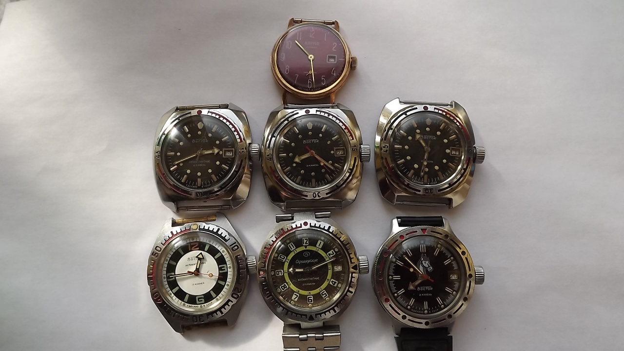 56шт.: Maurice Lacroix, Epos, Bulova, Seiko, Orient (3), Citizen, Armani, Океан, Авиатор, Полет (3), Родина, Спутник, Урал, Восток (6), Ракета (13), Слава (4), Чайка (3), ЗиМ, Победа, Заря (2), Луч, Дружба, Молния и тд... Два года скромного хобби