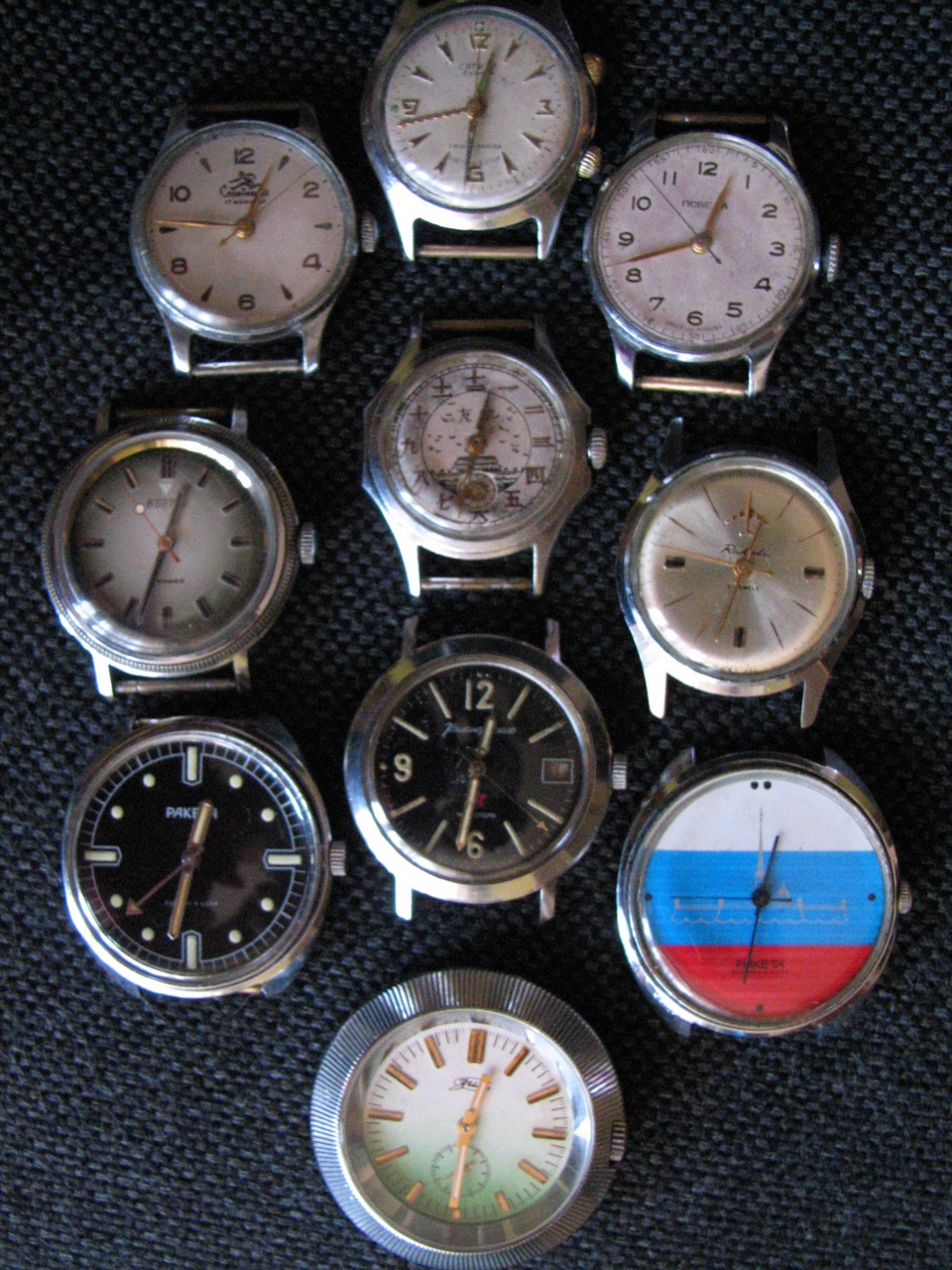 56шт.: Maurice Lacroix, Epos, Bulova, Seiko, Orient (3), Citizen, Armani, Океан, Авиатор, Полет (3), Родина, Спутник, Урал, Восток (6), Ракета (13), Слава (4), Чайка (3), ЗиМ, Победа, Заря (2), Луч, Дружба, Молния и тд... Два года скромного хобби