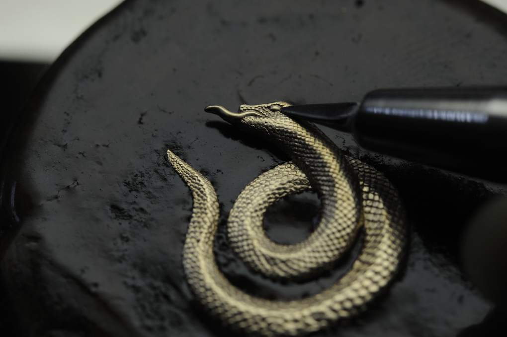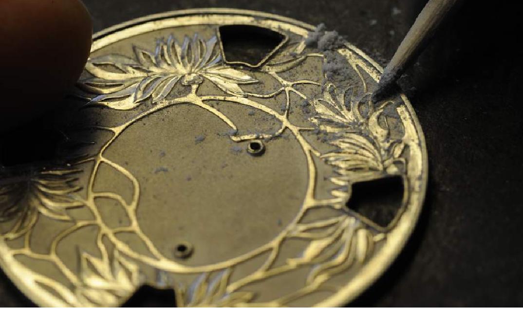 Мотив листьев, украшающий циферблат, берет свои корни из традиционной китайской иконографики и выгравирован непосредственно на металле. Благодаря специальной технике, рисунок не «утоплен» в циферблат, а элегантно выделяется, создавая рельефный объемный эффект. Создается ощущещние плывущих листьев. На создание фигурки змеи 1 мастер тратит около 30 часов работы. Следом идет стадия эмалировки «Большого огня» (Grand Feu enamelling) — техника, рожденная в Женеве и известная только избранному кругу часовых мастеров. Нанося