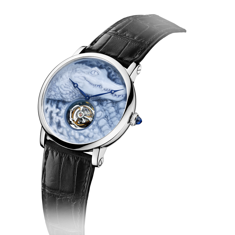 Часы укомплектованы элегантным ремешком из кожи аллигатора коричневого цвета с пряжкой из 18-каратного розового золота.