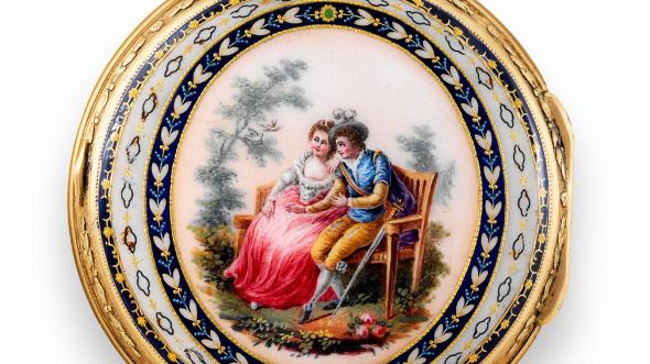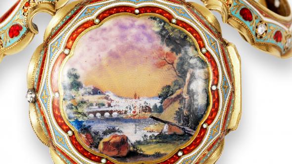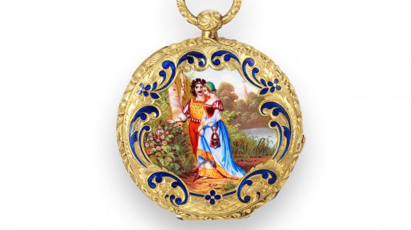 Эмалевая миниатюра – как наиболее эффектный способ создания сложных и, главное, ярких изображений на небольшом пространстве металла, стала основным средством украшения карманных часов. Именно миниатюрная живопись по эмали считается наиболее благородной, художественно выразительно и сложной из всех эмалевых техник.