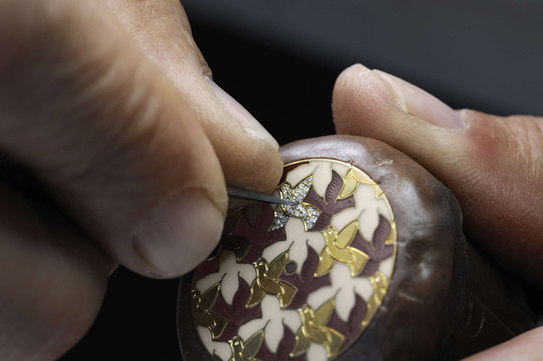Мастера компании воплотили на небольшом пространстве циферблата одну из наиболее благородных форм изобразительного искусства: живопись на эмали. На металлическую поверхность (в основном предпочтение отдаётся золоту и меди) художник наносит белую эмалированную основу, которую после нанесения подвергают обжигу в печи. Иногда эмалированию подвергают также обратную сторону обрабатываемого металла, что предохраняет его от растрескивания и деформации. На белой блестящей поверхности художник создаёт миниатюрный портрет или пейзаж, который наносится с помощью тончайшей кисти или даже в некоторых случаях волоска. Изображение практически «собирается» с помощью пунктирных точек. Этот метод рисования называется пуантилистский. По мере нанесения слоёв изображения проводится обжиг в печи, а затем наносится завершающий этап: нанесение последнего слоя прозрачной эмали. После этого изображение тщательно полируется.