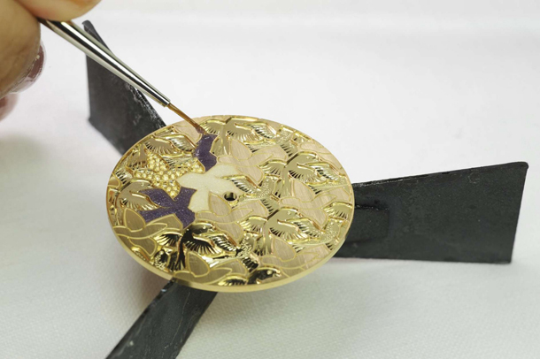 Так, для выполнения рисунка Champleve (шамплеве) мастер тончайшим лезвием вырезает в золотой основе миниатюрные ячейки, в которые слой за слоем заливает различные оттенки горячей эмали.