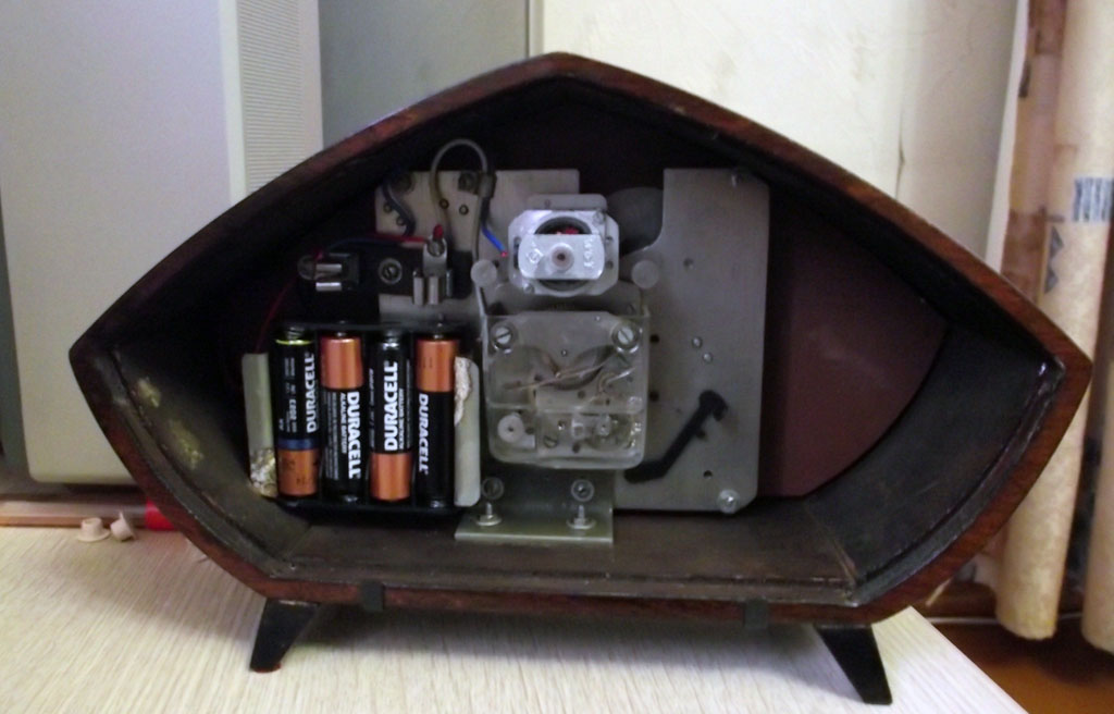 Механизм подзавода с текстолитовыми шестернями, моторчик на втулках, с одной батареей. На приставке 63-й год, на задней крышке дарственная надпись тоже датирована 63 годом.