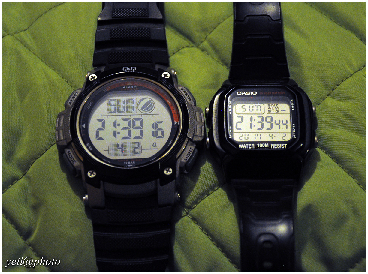 QQ на любителя т.к. на них на али очень много подделок на них по 300-400р., выглядят они "не понтово", в чём-то даже дешманско, но конкретно на убой у меня сейчас они, т.к. Casio W-800 очень мягкотелые, да и смотрятся на среднем или более запястье как-то не очень. Несмотря на то, что я поначалу наклеивал на них даже плёнки от смартфонов, пластиковая стекляшка уже вся в царапинах, а на корпусе пара глубоких задиров (не понятно откуда они вообще взялись). Как я уже написал, были бы они на 1-2см большей диагонали с подложкой дисплея такого же качества как была у W-800 с 3092 и минеральным стеклом, с ремешком сплошным на 24мм, цены бы им не было. Конкретно на моих нынешних W-800HG: В темноте сфоткать 100% выцветание сегментов не получилось (экран зелёный и разметка, времени под углом более 90 град не видно вообще. При 30 градусах и некоторых углах сегменты становятся значительно более тусклыми. Чётко видно время только если смотреть "как обычно на руке, параллельной поверхности". При включённой подсветке в темноте время смотреть тяжело, особенно ночью, руку надо поворачивать, меня это напрягает. Присматривался сначала к w-212, но на них из-за выпуклого стекла вообще тяжко из неудобного положения рассмотреть время без должного освещения.