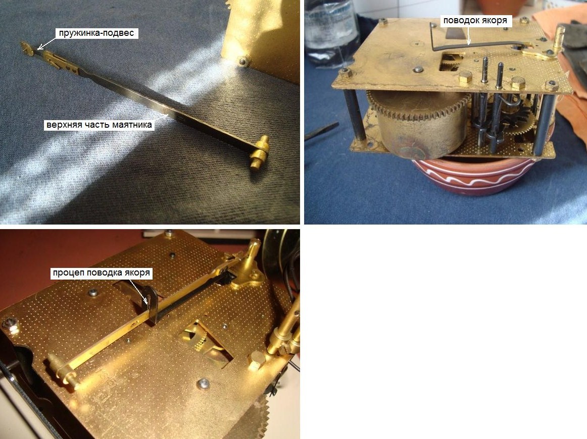 Разобрался с подвесом маятника. Выяснил, что положение пендельфера играет роль. Одна его часть чуть шире, чем другая. И именно она должна вставляться в неподвижный кронштейн, а уже на другую часть одевается сам подвес. Ну и чуть подогнул поводок якоря, куда он вставляется. Ход часов стал чётче, "тик" суше и теперь они не останавливаются от малейшего прикосновения.