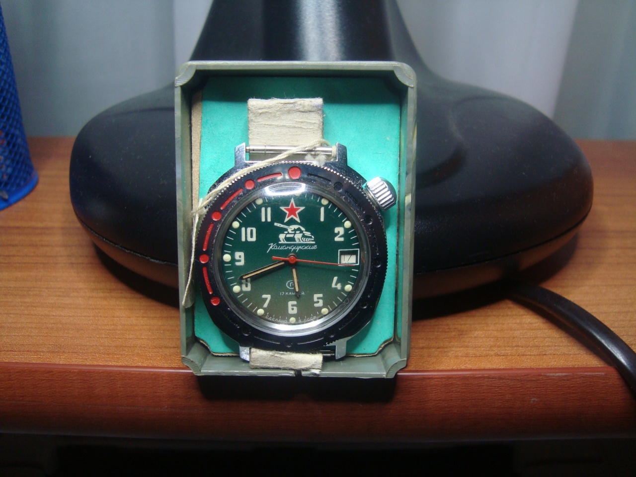 https://picasaweb.google.com/1130982...51972874753586 Коробочный внеш.вид,часы полный ноль,из под прилавка как говорится.Ход просто изумительный,во внутрь лезть пока не хочу.В паспорте написано: водонепрониц. корп. защищает мех.от попад. воды в случае,если часы наход. в воде не более 30 мин. на глубине до 1 метра.Вывод: амфибией и не пахнет,разве что красивый моторчик сунуть в нерж. корп. от настоящей амфибии.Я потерялся,не знаю как поступить,сунуть мех в нерж. и оставить себе в коллекцию или определить новому хозяину.Ув. мож.кто сможет определить хотя бы приблиз. ст. в убитых енотах.Извините за возм. некач. снимки.Спасибо.