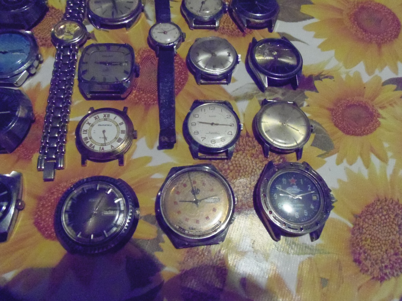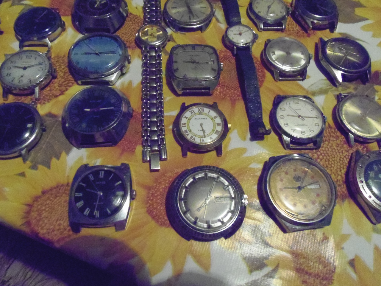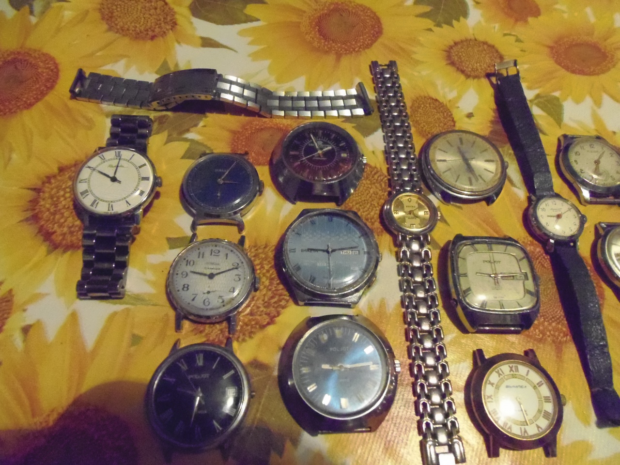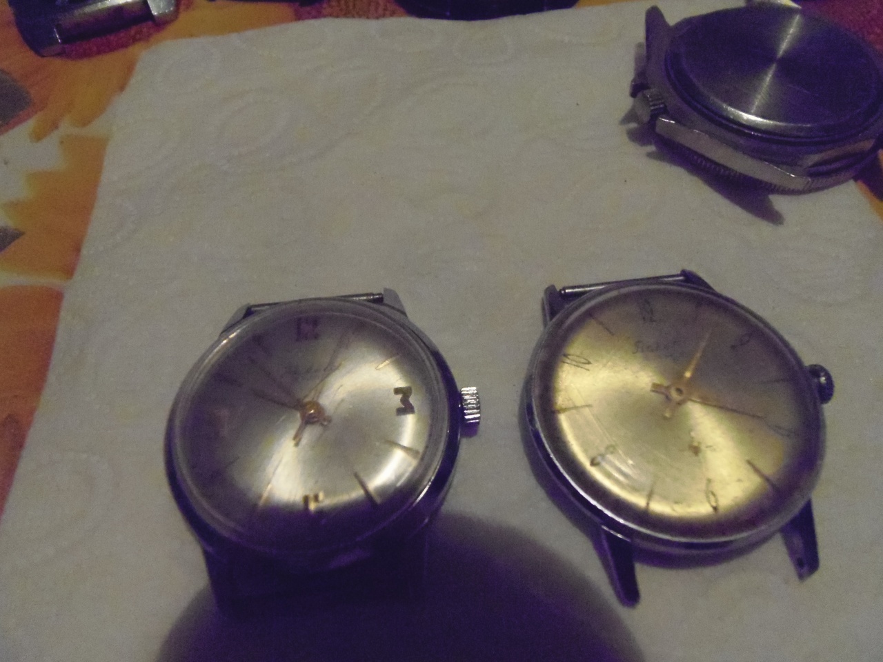 Один Полет 23 камня с автоподзаводом,на ходу.Oreintex на ходу,но головки заводной нет.Браслет 5 р.50 коп. литой,Ракеты вечный календарь-одна СССР,другая с королевским уклоном,наверное 90-е,на цифере не написано,но диск размечен до 2012 г.-обе на ходу.Юность дамская-детская-на отличном ходу.Дамские желтые SEIKO написано,внутри Миета,поставил батарейку-ходят.Первый раз вижу подделку Командирских вживую-я сначала и не понял,дома только смотрю,что-то не то-не то танк,не то бульдозер...