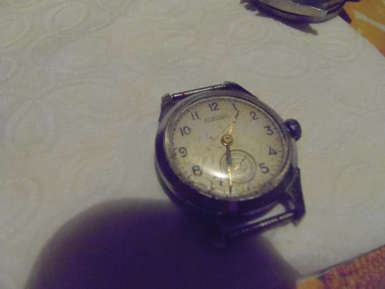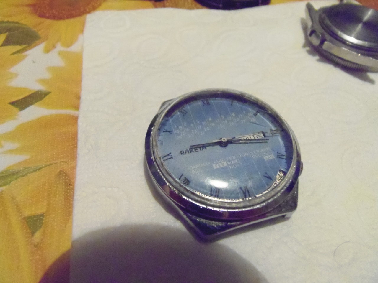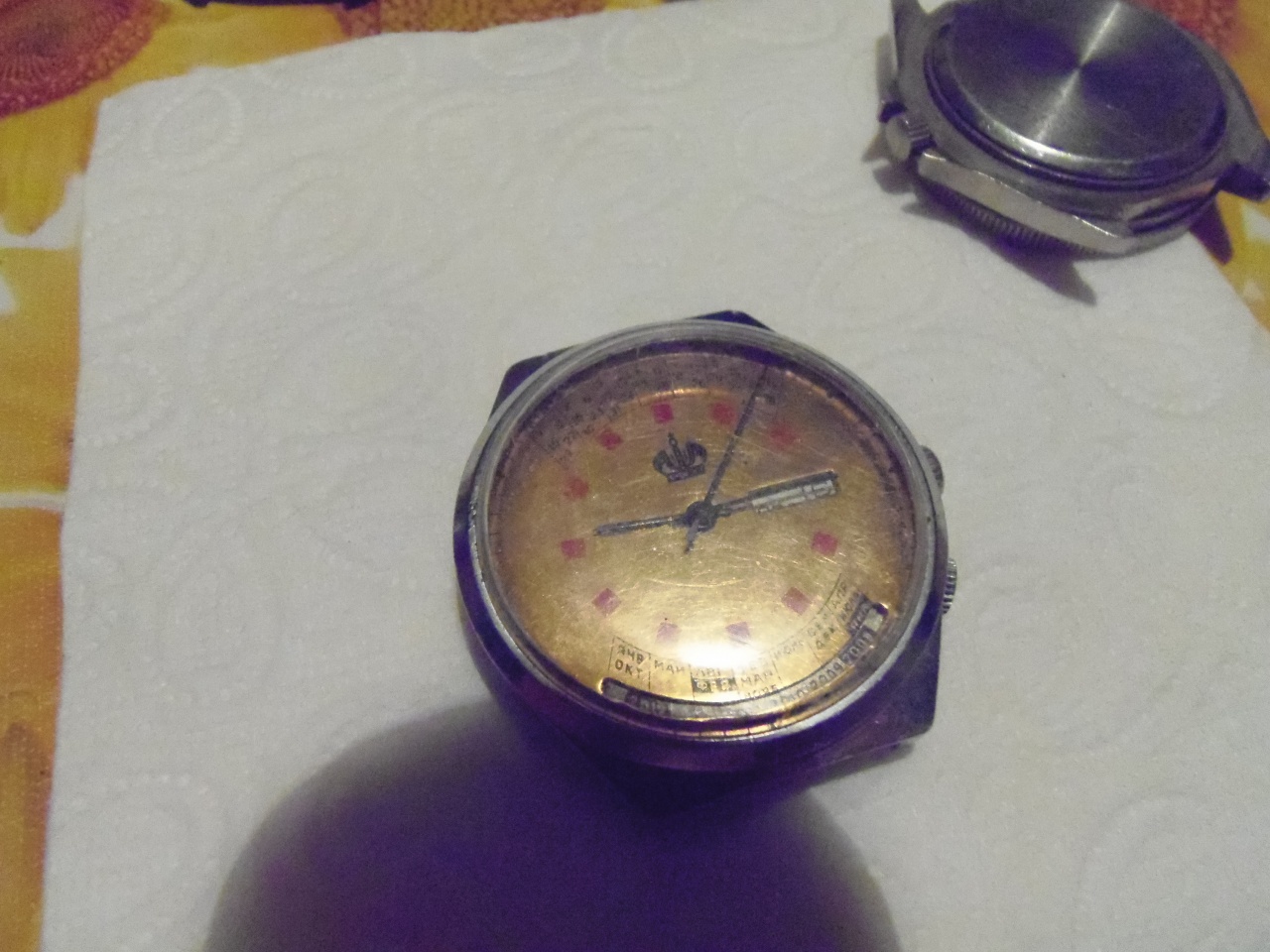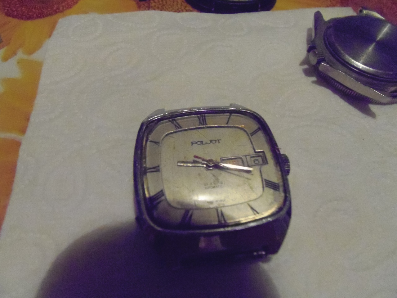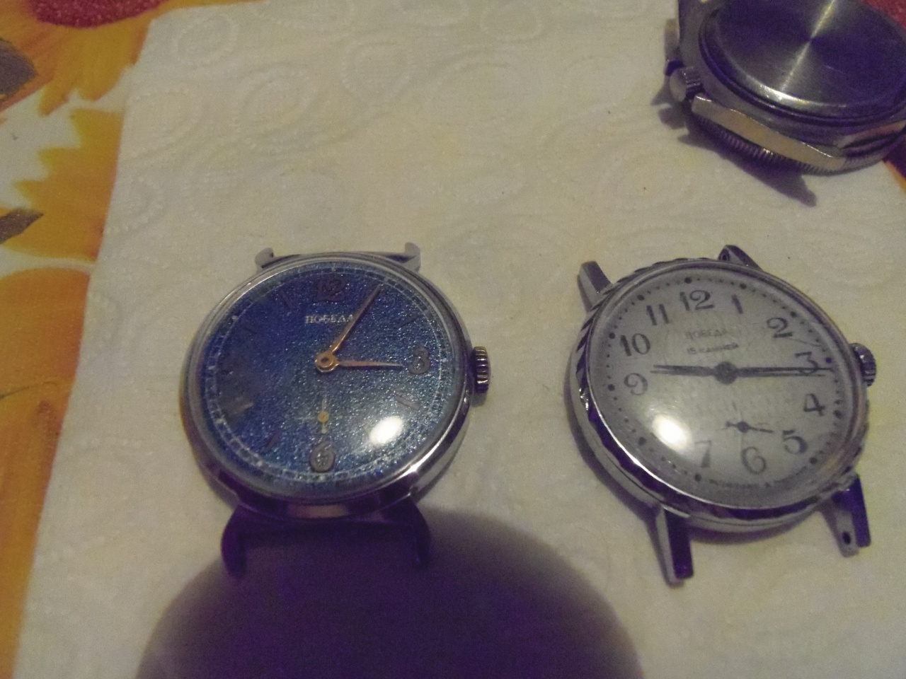 Один Полет 23 камня с автоподзаводом,на ходу.Oreintex на ходу,но головки заводной нет.Браслет 5 р.50 коп. литой,Ракеты вечный календарь-одна СССР,другая с королевским уклоном,наверное 90-е,на цифере не написано,но диск размечен до 2012 г.-обе на ходу.Юность дамская-детская-на отличном ходу.Дамские желтые SEIKO написано,внутри Миета,поставил батарейку-ходят.Первый раз вижу подделку Командирских вживую-я сначала и не понял,дома только смотрю,что-то не то-не то танк,не то бульдозер...