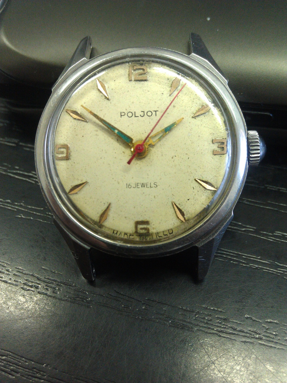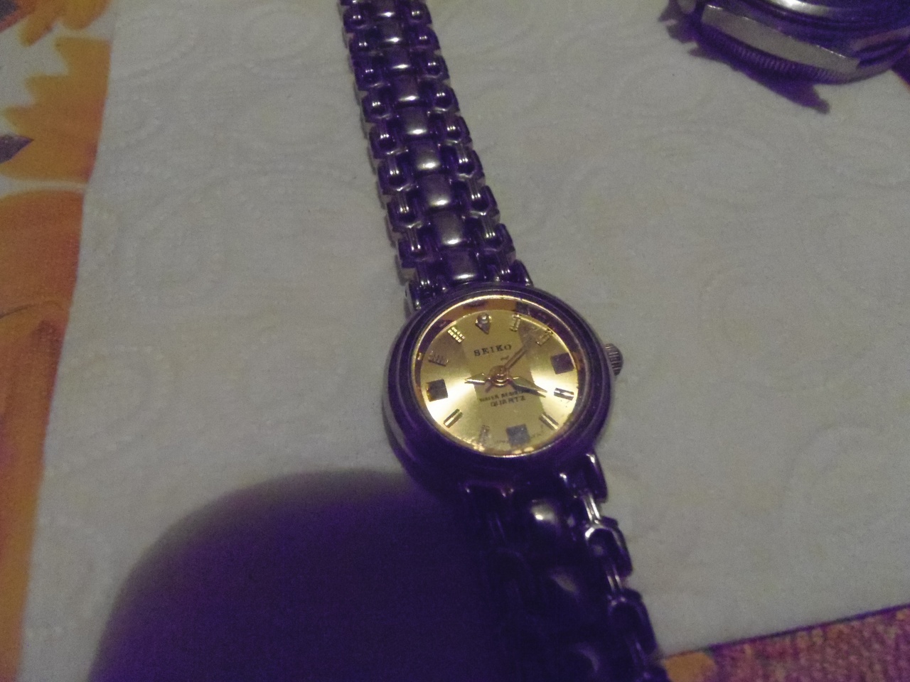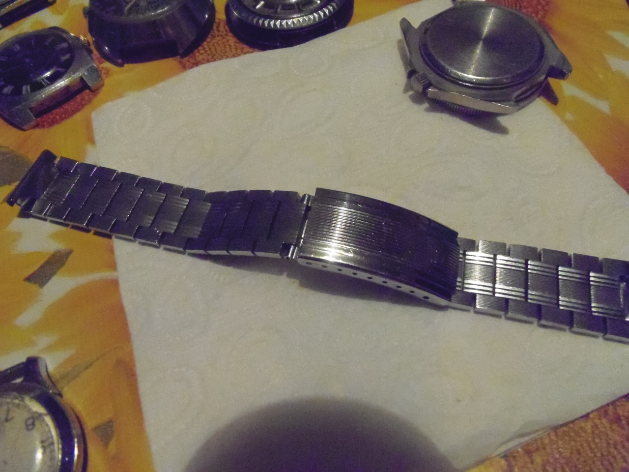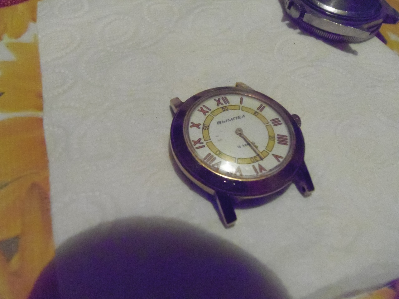 Один Полет 23 камня с автоподзаводом,на ходу.Oreintex на ходу,но головки заводной нет.Браслет 5 р.50 коп. литой,Ракеты вечный календарь-одна СССР,другая с королевским уклоном,наверное 90-е,на цифере не написано,но диск размечен до 2012 г.-обе на ходу.Юность дамская-детская-на отличном ходу.Дамские желтые SEIKO написано,внутри Миета,поставил батарейку-ходят.Первый раз вижу подделку Командирских вживую-я сначала и не понял,дома только смотрю,что-то не то-не то танк,не то бульдозер...