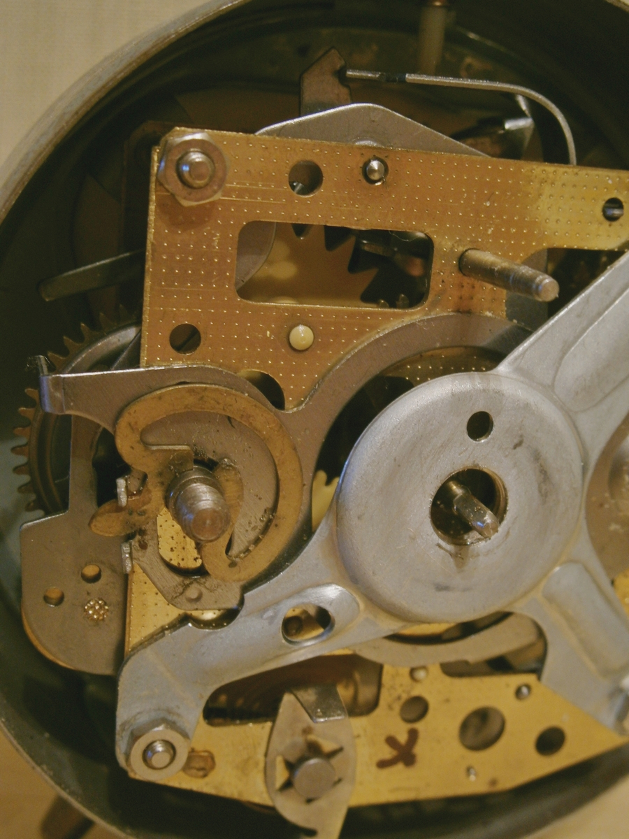 Механизм тикает несколько секунд , если тронуть рычажок рядом с храповичным колёсиком . От самого будильника дымом пахнет - видимо , пожар пережил . Но - времени на всё не хватает - пускай лежит в запасниках Музея ... От него веет шестидесятыми - этого достаточно ...