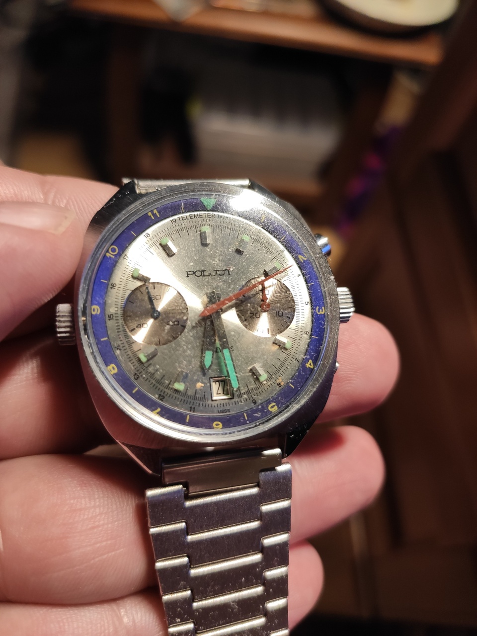 Вот приобрёл новое переиздание советских Штурманов производства Волмакс. При переводе часов обнаружил удивительную вещь. Часы со стоп-секундой,а это значит механизм с 31659. И не поверил, мех то советский. Как в 2021 году, в новых часах стоит советский мех. Один только вопрос, он новый и собран из запчастей, или он б/у и просто сделан репассаж. Жаль что стоит пластиковое проставочное кольцо, а не напрямую лапками крепиться в корпус. ЦСС и минутный накопитель (стрелка), кажется тонковатыми по сравнению с оригиналом. Циферблат визуально выигрывает у оригинала. Манежи утоплены, и это видно хорошо, что это идёт в + циферблату. Ушки 19мм, хотелось бы 20 мм. Корпус 40 мм сделан отлично, стекло на расстоянии, как бы увеличивает циферблат. Читаемость хорошая. Я бы сказал, современное переиздание в целом по совокупности удалось на мой взгляд.