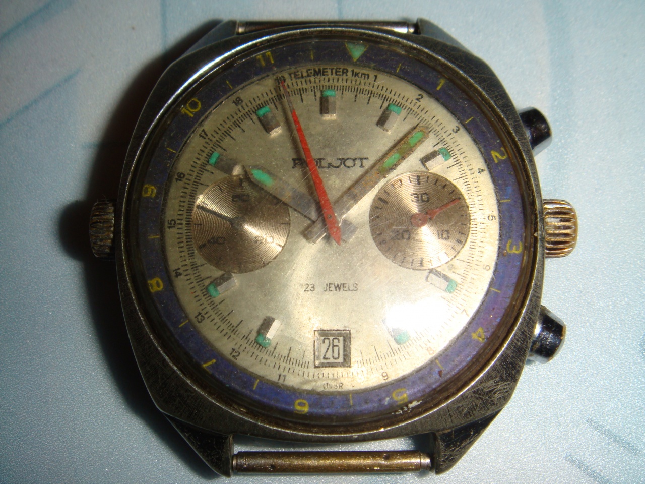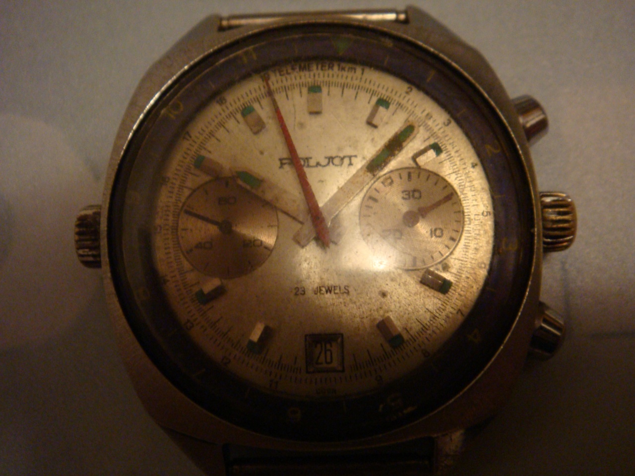 Гуляя на рынке, забрёл к часовщику в поисках браслета для до этого приобретённых часах луч "Олимпиада 80" и тут случайно увидел у него в продаже Poljot USSR. Покрутив в руках, подумал ширпотреб конца 80 и начала 90. Так как я не профессионал в часовом деле, я плюнул и ушёл. Но дома заинтересовавшись моделью начал искать инфу про них и понял, что в принципе часы популярные с неплохим механизмом. Через неделю обратно заехав на рынок, я спросил посмотреть ещё раз и решил, что возьму. Попросил открыть механизм, он был чист, надпись 3133. Единственная существенная проблема была в том, что кнопочки по бокам нажимали в пустоту, вернее просто ничего не нажимали. Сами часы ходят довольно таки точно, маленькая секундная бегает, А красные стрелки стоят, видимо чего то не хватает или халтурная сборка попалась, что делать? Купил за 9,5 евро Внутреннюю часть позже сфоткаю на нормальный фотик. Вот внешняя фотка с телефона: