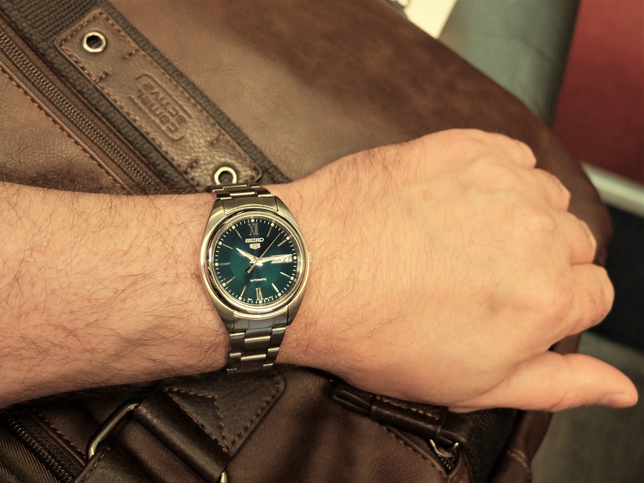 Приятной неожиданностью оказалась несвойственная для простенького механизма 7S26 точность- всего -5 секунд за неделю! Конечно, понимаю, что это ненадолго, но всё же порадовало! А ещё одной неожиданностью оказался... размер. 15-20 лет назад эти стандартные для "пятёрок" 37-38 мм казались чуть ли не крупным размером! Помню, что первые мои такие часы- ещё на механизме 7009, с глухой задней крышкой, купленные году в 94-м- 95-м, казались большими по сравнению с Ракетой, которую носил раньше. Сейчас же этот размер считается "самым малым из мужских", всё что меньше- уже записывают в унисекс, а то и в женские. Для меня то, что часы некрупные, скорее достоинство- от гигантомании немного устал, и носить на руке 45-миллиметровую "гирю" уже нет желания. Ну а циферблат... К сожалению, мои любительские фото не передают всей его красоты. Попробовал отредактировать снимки так, чтобы цвет был близок к реальному, но получилось это "на троечку". Всё же поделюсь ими с вами, любители "пятёрок"и все поклонники славной марки Сейко. Ведь радоваться за компанию всегда приятнее, чем в одиночку!