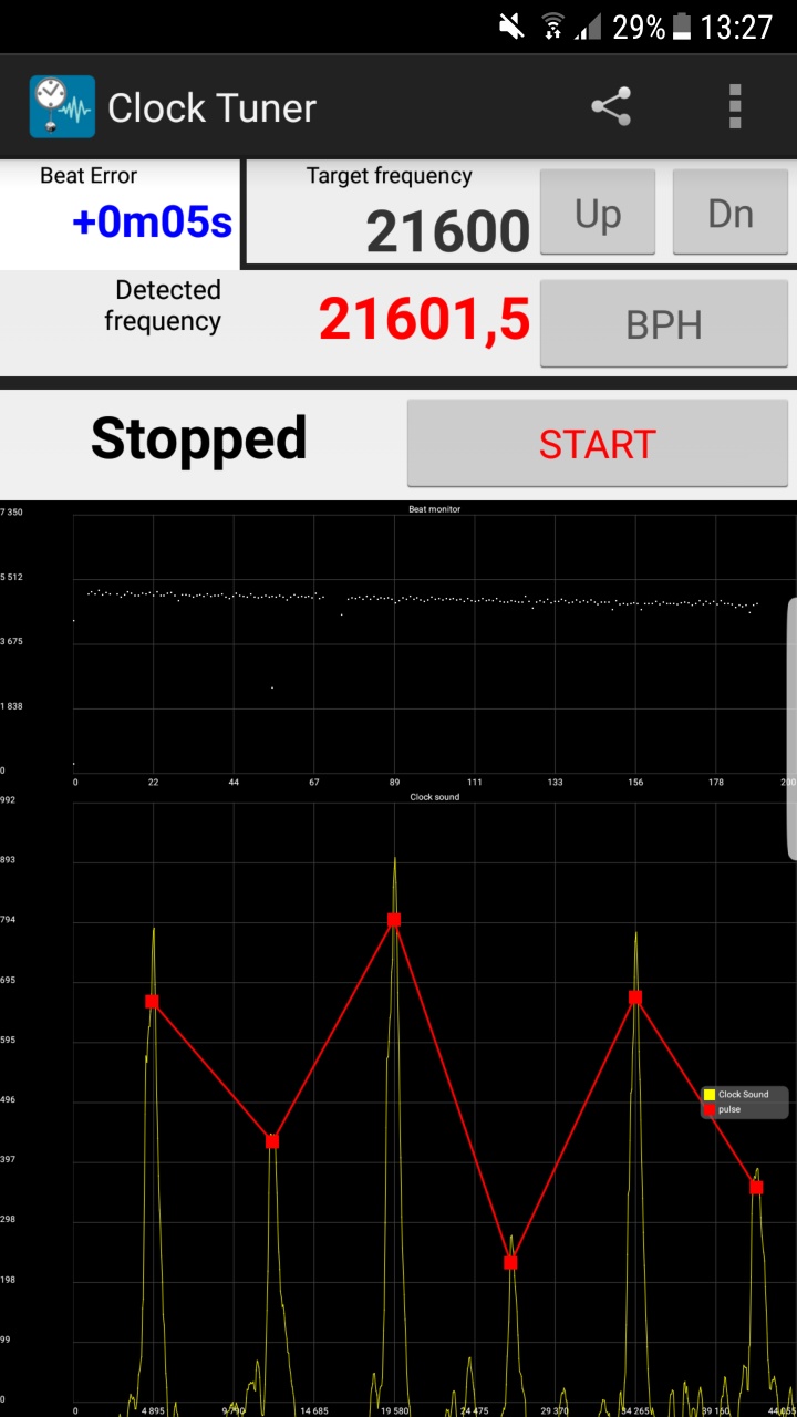 НУ и когда телефон "услышал" часы, а вы все настроили, то можно приступать и к самой регулировке: запустили измерение узнали текущую точность, остановили, изменили положение градусника, ну и повторяем эти действия до желаемого результата. Я восток настраивал 3 раз: 1 раз на полном заводе, 2 раз спустя сутки, 3 раз сново на полном заводе. Ах да, еще там нужно будет выставить частоту П/Ч