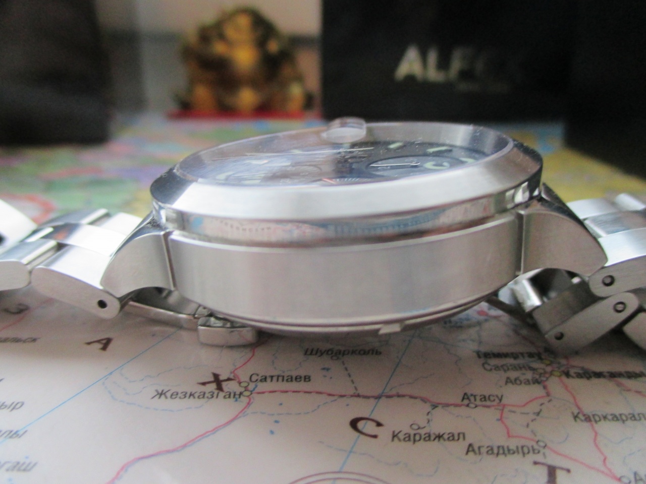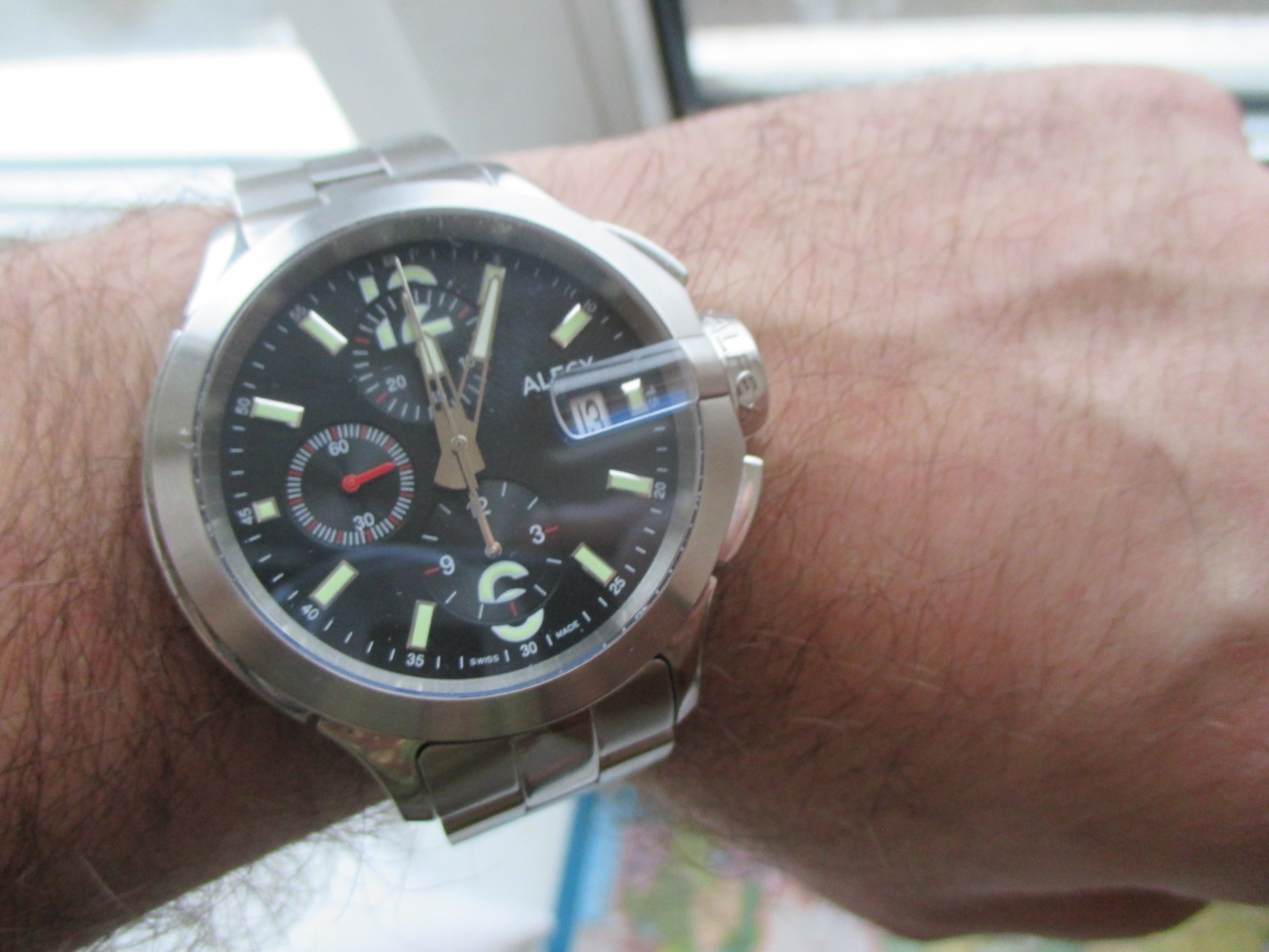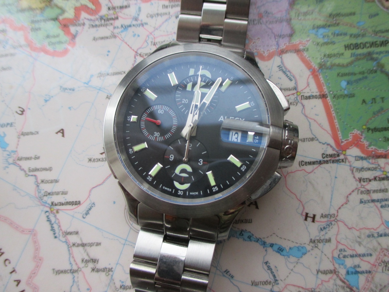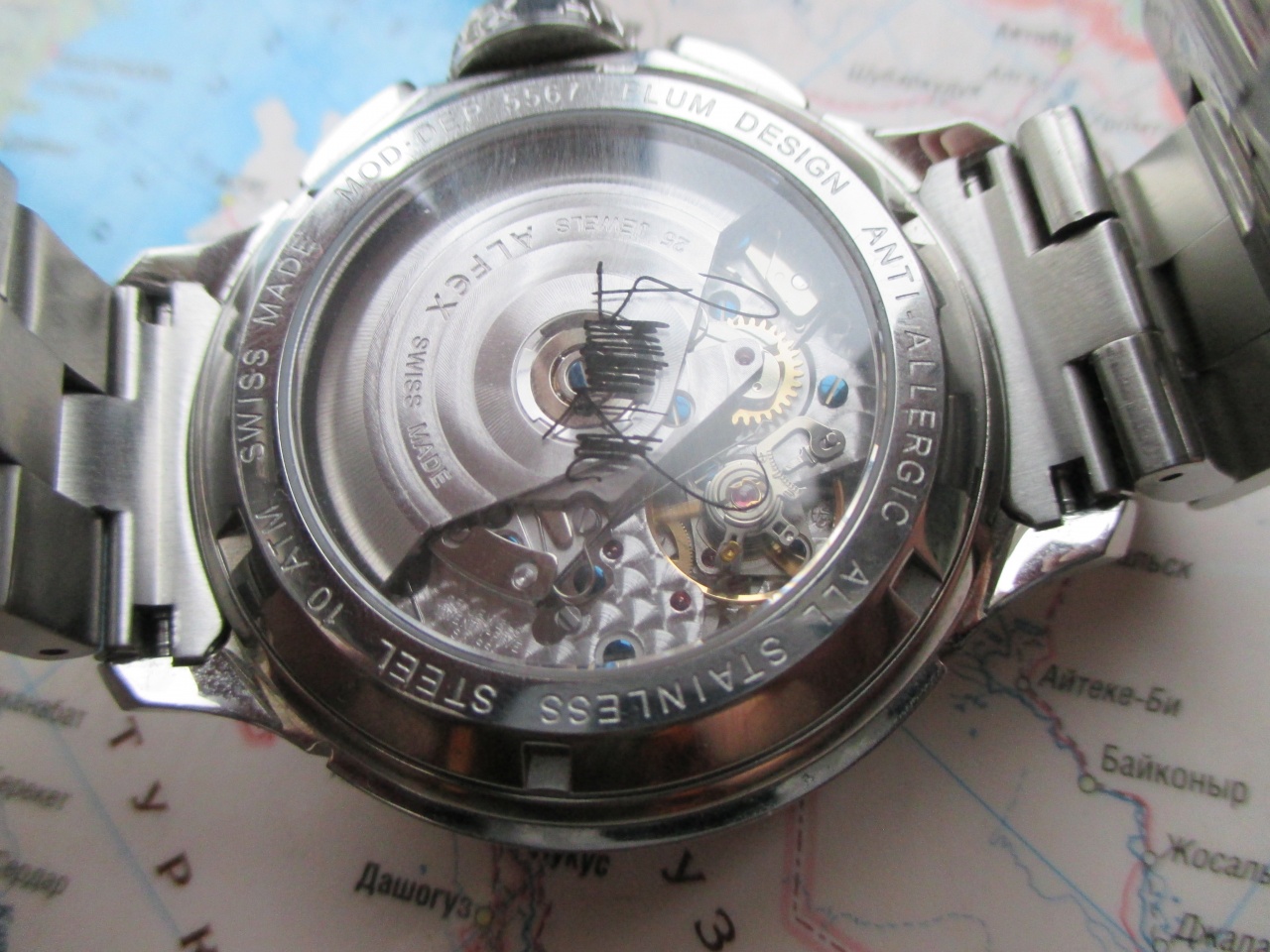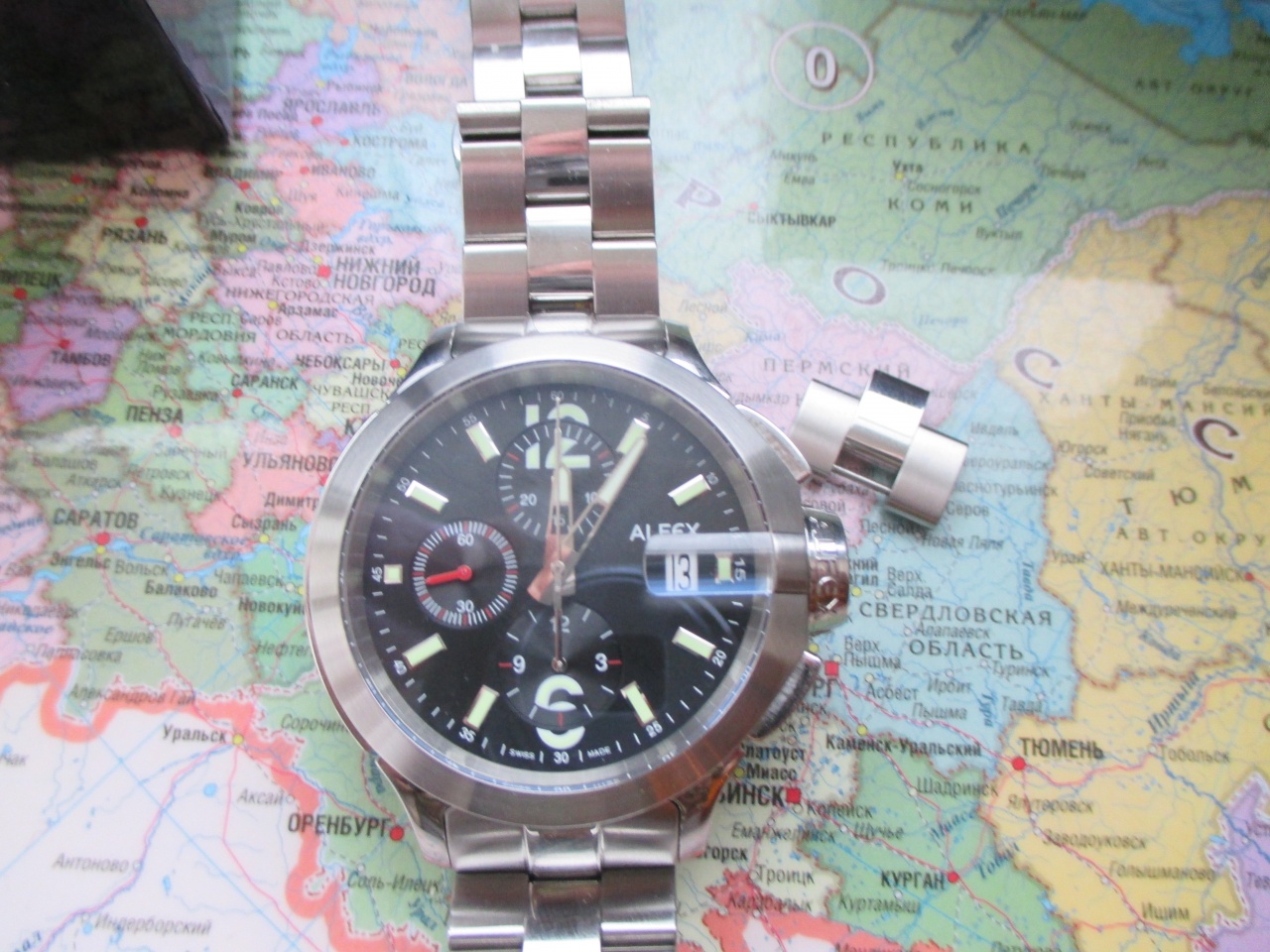 ALFEX на легендарном механизме 7750, отличающимся высочайшей надёжностью, точностью хода и чудовищным запасом хода (более 50 часов)!!! Крупные 44мм., сложной формы, сатинированные и полированные поверхности, сапфировое стекло, сложная завинчивающаяся заводная головка, тяжелые, на литом браслете. Оригинальный заметный дизайн. Отличное состояние ААА, не поставил, т. к. снято 1 звено и есть микроцарапки на браслете. Противоударные, водозащита 100 м. Хорошо и долго светятся в темноте. Метки накладные. Купил год назад, за это время носил не более месяца, в сете много других часов, но подзаводил чтоб не густело масло, регулярно. Фактически они почти новые. Механизм красиво декорирован, на стекле подпись Бернарда Русси.