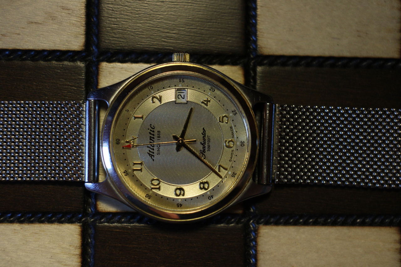 Atlantic Seahunter 7034. Первые серьезные часы, которые я носил постоянно с 4 по середину 9 класса, и до сих ношу раза два в неделю. Согласен, очень не хило – швейцарские часы четверокласснику! Но они мне достались просто потому, что отец как-то сказал, что если после замены батарейки, они пойдут, то станут моими. Дело было не так просто, ведь у него они уже года два на тот момент не ходили, хотя он с ними посещал двух мастеров, которые ставили новую батарейку, которой в обоих случаях хватало на две недели, он себе тогда купил хронограф Swiss Military Hanova, с которым до сих пор ходит, а