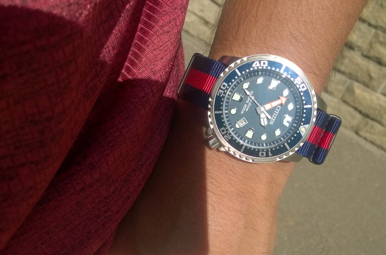 Хех, а вот с таким ремешком можно даже немного пожалеть, что безель у этих Ситизен не пепси - в смысле не красно-синий... впрочем, и так неплохо смотрится