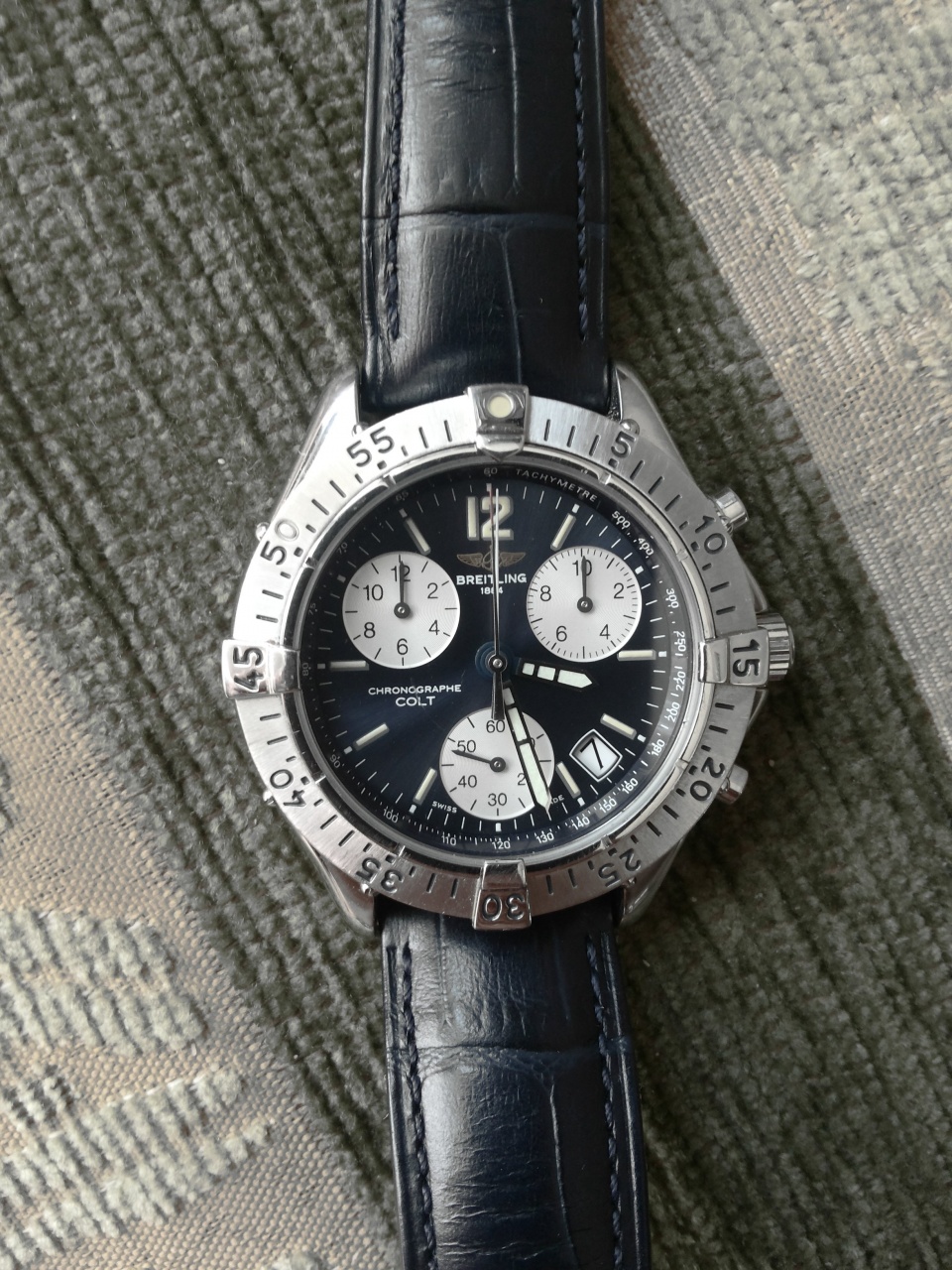 Breitling Colt Chronographe, A53035, в комплекте только часы на темно-синем аллигаторе Hirsch. Очень красивые часы, черный цифер с синим отливом, брутальный брайтовский безель, 38мм без ЗГ. Часы покупались на форуме. Продаются по причине маленького размера часов для моей руки. Часы находятся в Ростове-на-Дону - возможна пересылка после 100% предоплаты.