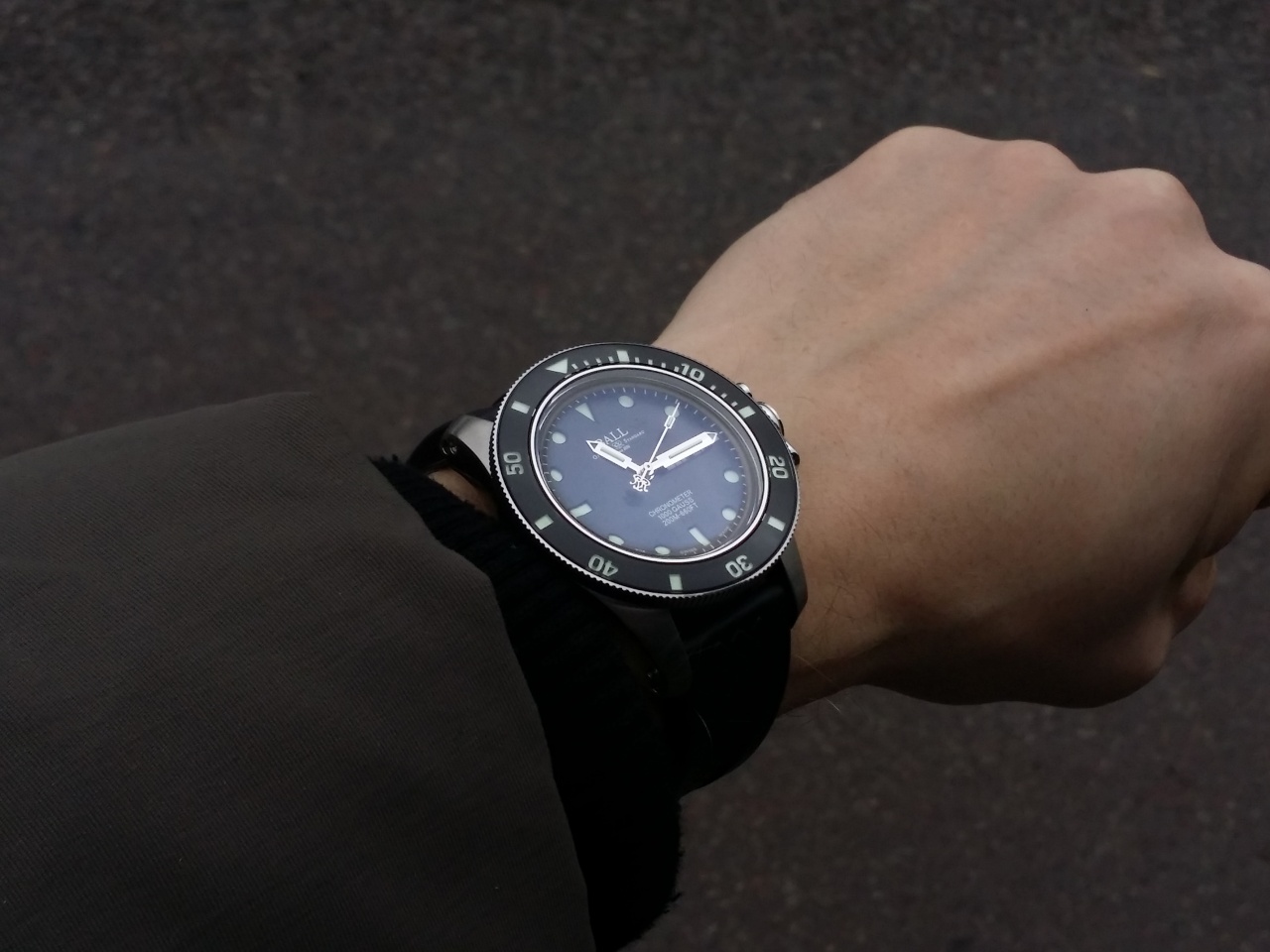 Общий вид. Выглядят больше своих 40 мм. Я бы даже сказал, что на мою руку 17,5 см они только- только что не велики. Толщина 14,5 мм. Много, но бывает гораздо больше. Вес на браслете без двух полных и двух малых звеньев 198гр. На неродном кауче примерно 125гр. Браслет как у асех стальных гидрокарбонов, но более узкий. Застёжка, как всегда, шикарно сделанная (на ней, кстати, гордо выбито Свисс Мейд), но, как всегда (для меня), не удобная в носке. Хотя тонким подбором длины браслета я смог добиться удовлетворительной эргономики ношения. Один день попробовал на браслете, потом пересадил на обрезной каучук с бабочкой, благо, что за годы часовой болезни у меня не только часов поднакопилось, но и ремней всяких.